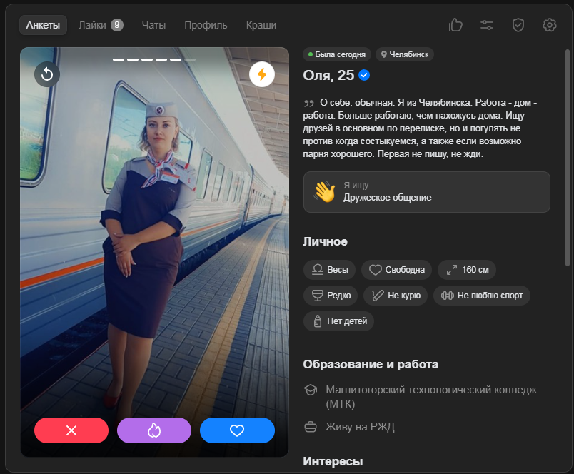 Минимальные правила предосторожности, чтобы не стать жертвой скамеров: 1) Не присылать никому всякие нюдсы и дикпики (даже без лица), не соглашаться на предложения "пошалить по вебке" и т.п. 2) Не переходить по подозрительным ссылкам в переписке (а если все-таки перешел - не вводить там никаких личных данных) 3) Не соглашаться на просьбы одолжить денег, купить что-то (в том числе билеты в театр или кино), или задонатить куда-то 4) Встречу IRL назначать только в проверенных местах и заведениях 5) Не соглашаться на предложения во что-то инвестировать или влошиться еще в какой-нибудь проект, обещающий чудесные доходы. Самый неприятный скам, поскольку перед этим тян может изображать активное и заинтересованное общение на протяжении нескольких дней, кидать кружочки и голосовухи, пока не войдет в доверие. Обычно они утверждают, что живут где-то за границей и не могут встретиться прямо сейчас, и очень быстро предлагают перенести общение с СЗ в мессенджеры. Подробнее - гуглить "pig butchering scam". К постоянному вопросу "неужели на такое кто-то ведется": лох не мамонт, лох не вымрет. Если этим продолжают заниматься - значит, кто-то ведется.