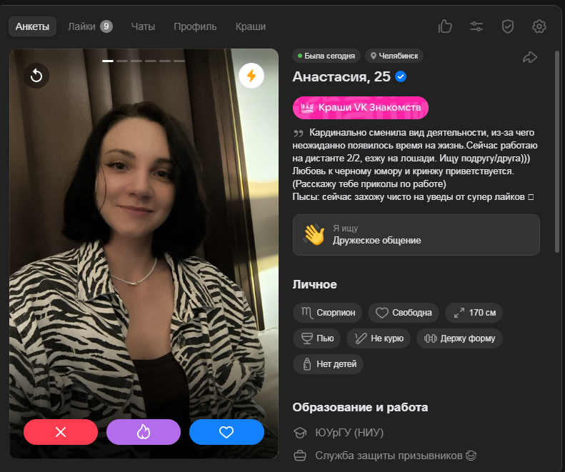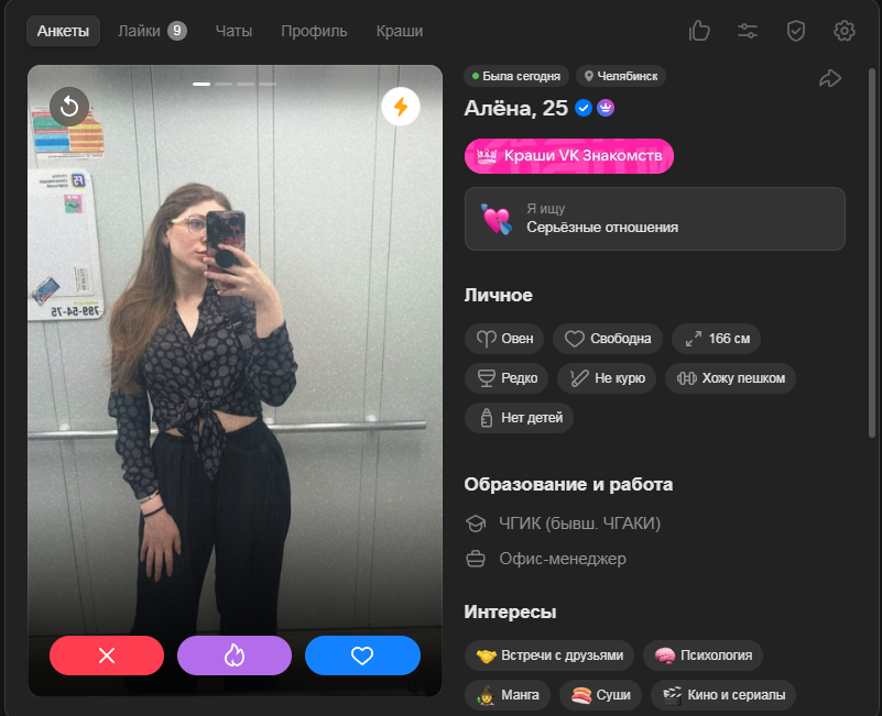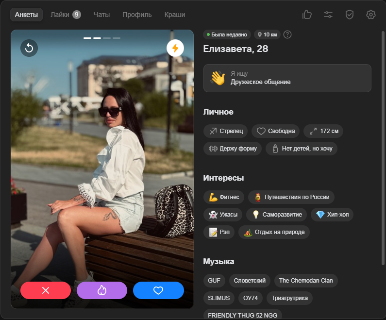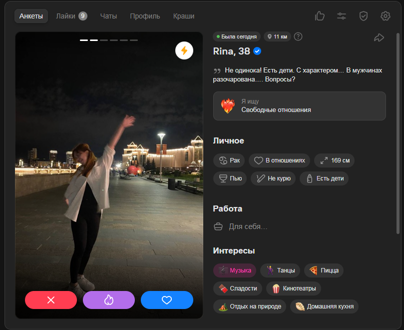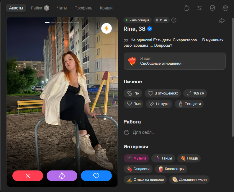 Конечно она, не тёплый клиент, как тян с сз, пиздит общается нормально реагирует на прикосновения, но чтобы ее соблазнить и трахнуть уйдёт несколько месяцев и свиданий 5-10 качественных встреч. За руку взять даёт, но потом приобнять? Куда нахуй я тебя 2 часа знаю. Нехватает адекватности ей, бывший пил бил и чмо теперь мне, ну или любому другому парню нужно доказывать что классный. Хочет прям очень серьёзных отношений. Так что на неё забил, может на танцы с ней схожу, а так буду дальше добывать людей на улицах, или где нибудь в заведениях