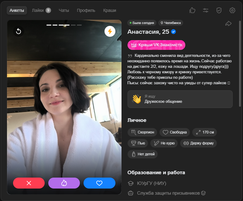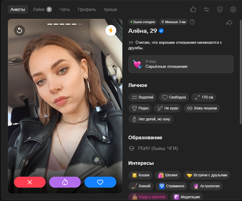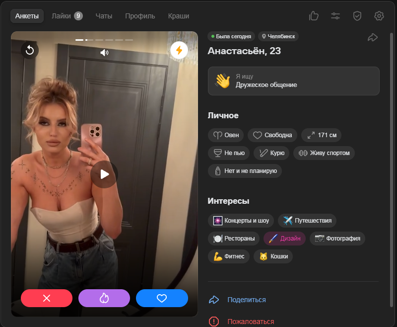 >>10306622 на ДайВинчике взаимки только от жирух(бывают сами пишут и диалог активный ахахах)Стройные лайкают раз в пару недель и оказываются мошенниками с биржевыми пирамидами.Таков положняк онлайн-знакомств мухосранского формата)