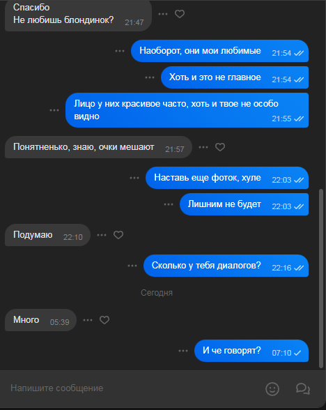 Общаюсь с тянкой третий день, и она чет совсем охуела, за сегодня не задала ни одного встречного вопроса, даже дефолтное «а ты?» в ответ на мои. Пишет странно, то много сообщений, то как будто на отъебись ответила, продолжает при этом иногда заходить на сз. Крч, учитывая все это, думаю можно особо не рассчитывать на нее. Прост сосет ресурс в поисках варика получше. Убавлю пожалуй активность в общении до редких ответов раз в час-два и завтра позову на похуй куда-нибудь ее, а там посмотрим да-да, нет-нет.