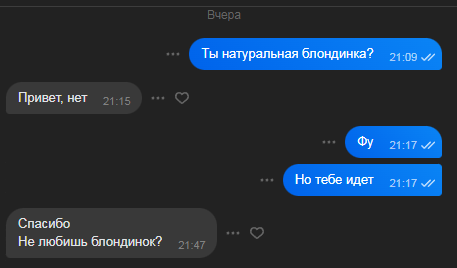 Кароч щас весёлый нет случай был. В вк знакомствах увидел бабёнку, ну прям из моих мечт. Прекрасное лицо, выразительные синие глаза, светлые волосы, немного жирка, размер вроде как подходящий. Я конечно лайкаю... и случается матч! Я немного ошарашенный пишу приветствие нет, не дашь писка ебат, она не в сети, ну и чуть позже я тоже вышел. Где-то через полчаса решил зайти и заскринить пару фоток, чтобы потом мастурбировать если диалог не пойдёт. Захожу в чаты, она в сети и прочитано. Хочу нажать на диалог, и... Он у меня на глазах удаляется)). Нахуя было лайкать, спрашивается?..
