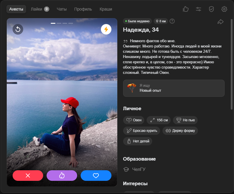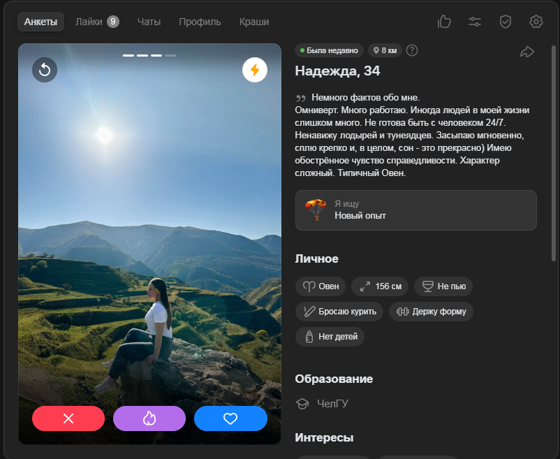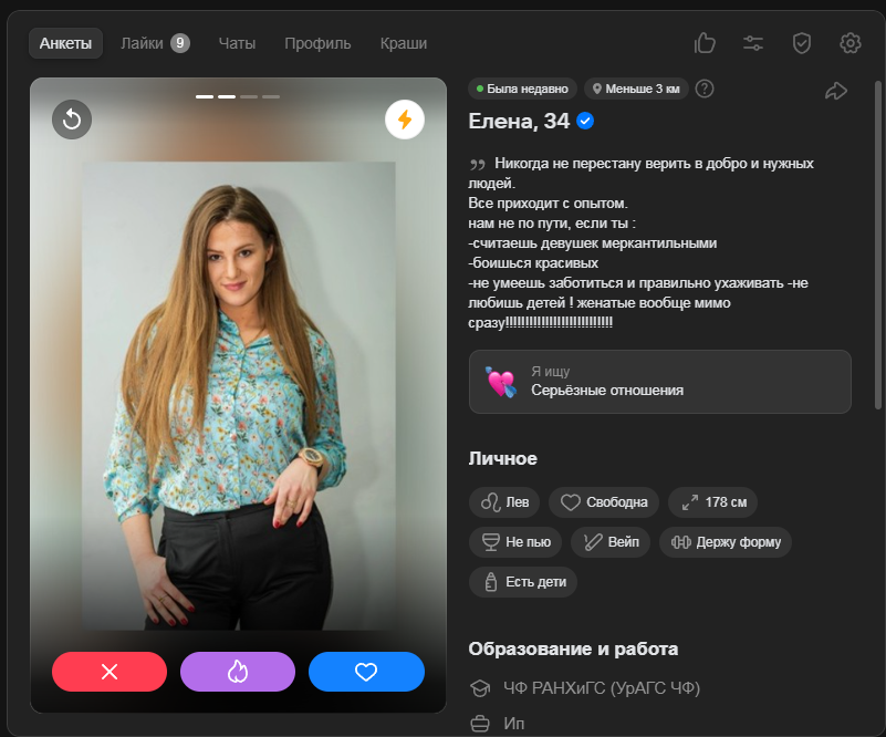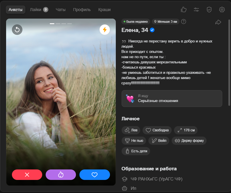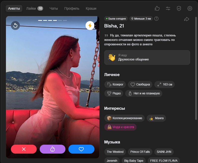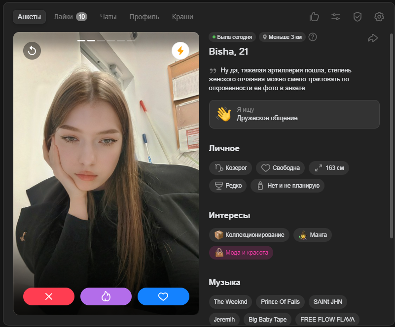 >>10313452 Хотя вот даже несмотря на все негативные факты, искренне не понимаю, почему столько дизлайков у него. Обычнотян вполне может его лайкнуть, конечно в процессе общения велик шанс будет, что сольет в пользу более красивого, но причин именно на стадии анкет его отметать со стороны тянок не вижу. Разве что обычные девушки окончательно съебались с сз и там сейчас только шлюхи с завышенными ожиданиями сидят.