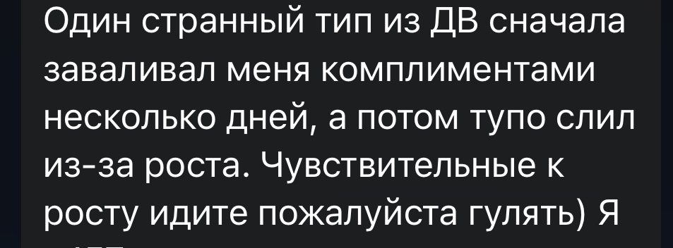 Нихуя не понимаю.То пишут что чеды 190 см не могут месяцами с сз никого вытащить на улицу,то карланы 165 см получают лайки как из пулемета и им сами пишут.А вообще заметил такую херь в крайнее время,что карланам легче остальных достаются тян.Вот хз как жто объяснить:что не карлан ниже 170,то ебака-террорист.Будто в рф появился анти-инцел тред.