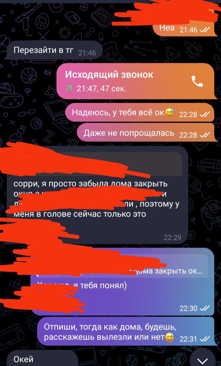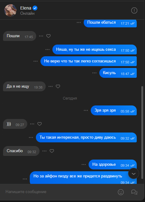Это ,3 минутное шоу, несмей называть секс А то существо в которое ты хуй засунул, это не тян. >чел, где ты в переписе увидел намек на деньги Так ты ее трахал или переписывался ? По всему твоему рассказу все больше и больше подробностей Итог теперь такой: ты нарк, трахнул солевую спидозную шлюхю. Вот так те кто приезжают на такси и по поведению это шлюха называется, вдруг ты не знаешь. А созвон хорошая вещь вдруг там крокодил какой то и ты просто деньги проебал на шлюху