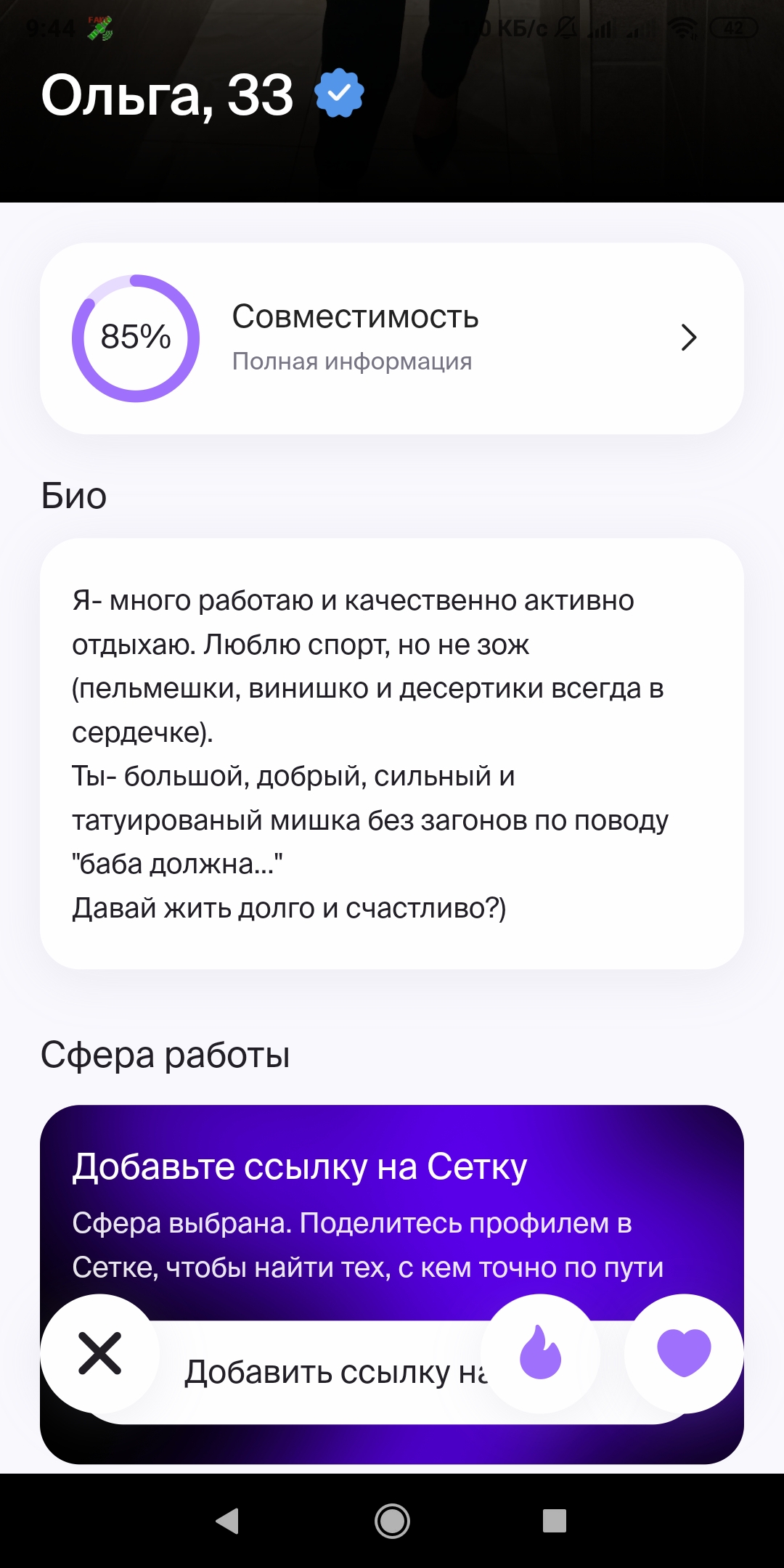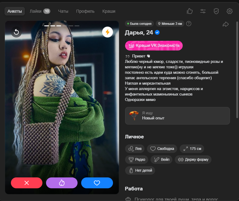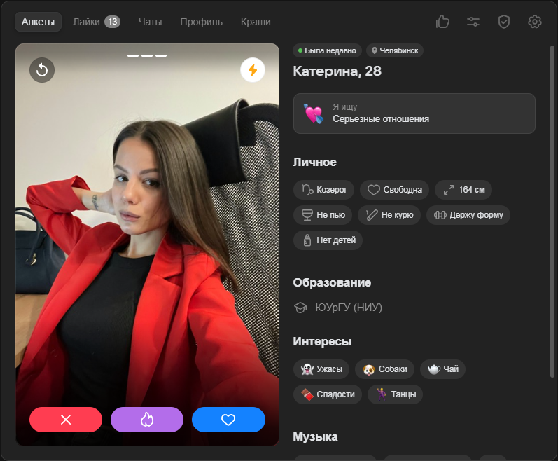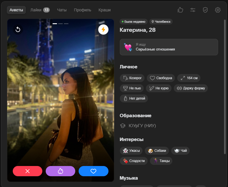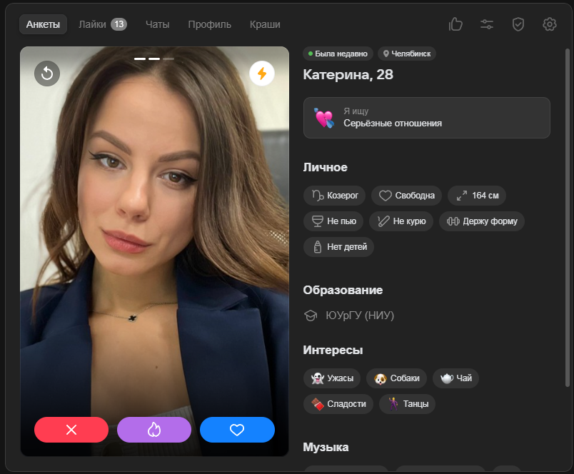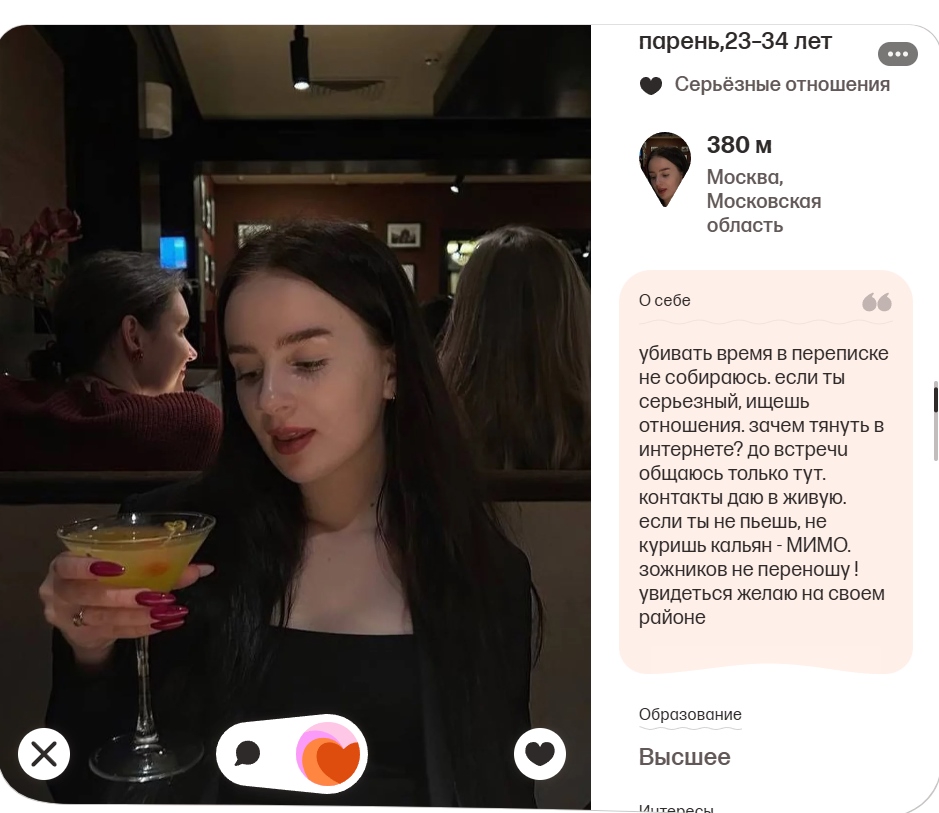 >>10323386 Ну тут я выше уже писал, что норм анкеты там вполне себе есть, но взаимных лайков в разы меньше, чем 2-3 года назад было в тиндере и вкшном дайвинчике.