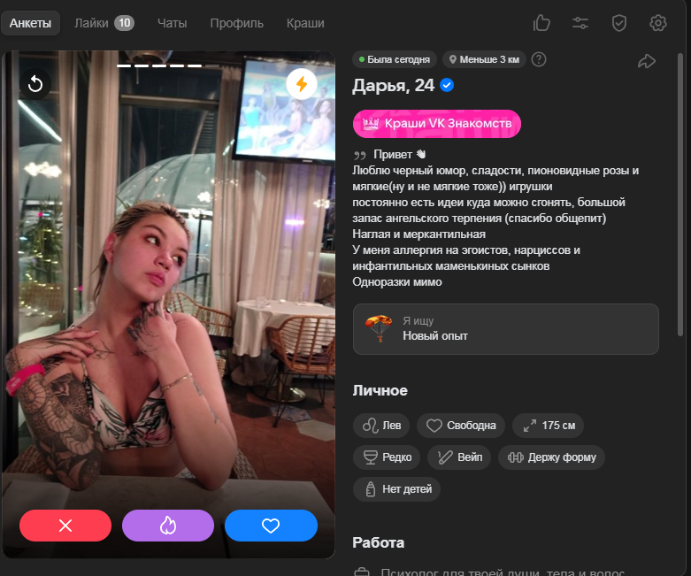 >даже страшно представить кто там сидит и конкуренцию делает, бред питы одни на ламбах наверно Я сделал женский акк, там такой пиздец, 80% всякий неликвид типа я сделал сэлфи в хрущевке или я курю в бмв. Но нормальных они сука не лайкают. Или тиндер меня в шэдоубан кидает, хотя говорят когда какие-то лайки есть это не он.