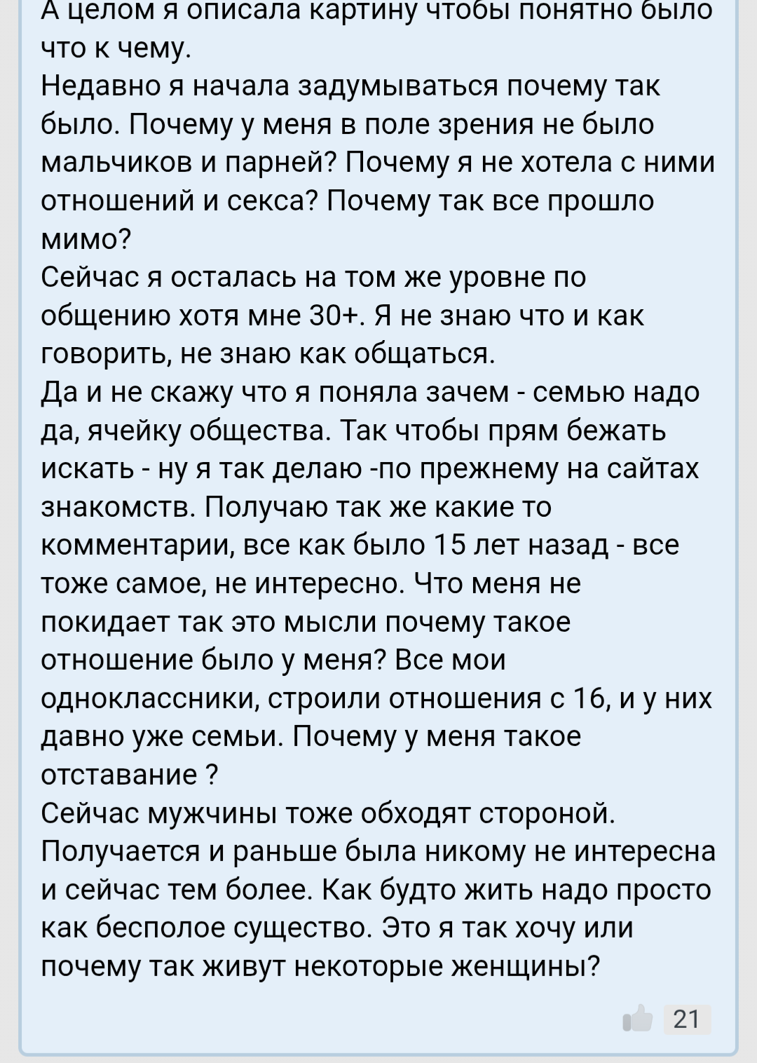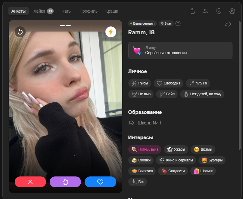 Короче, заебало. Уже не лайкаю в ответ. Постоянно вижу, как повторяется один и тот же сценарий. На вид красивая, адекватная тянка. А на деле общаешься с манекеном, который в лучшем случае заигнорит, в худшем нахамит