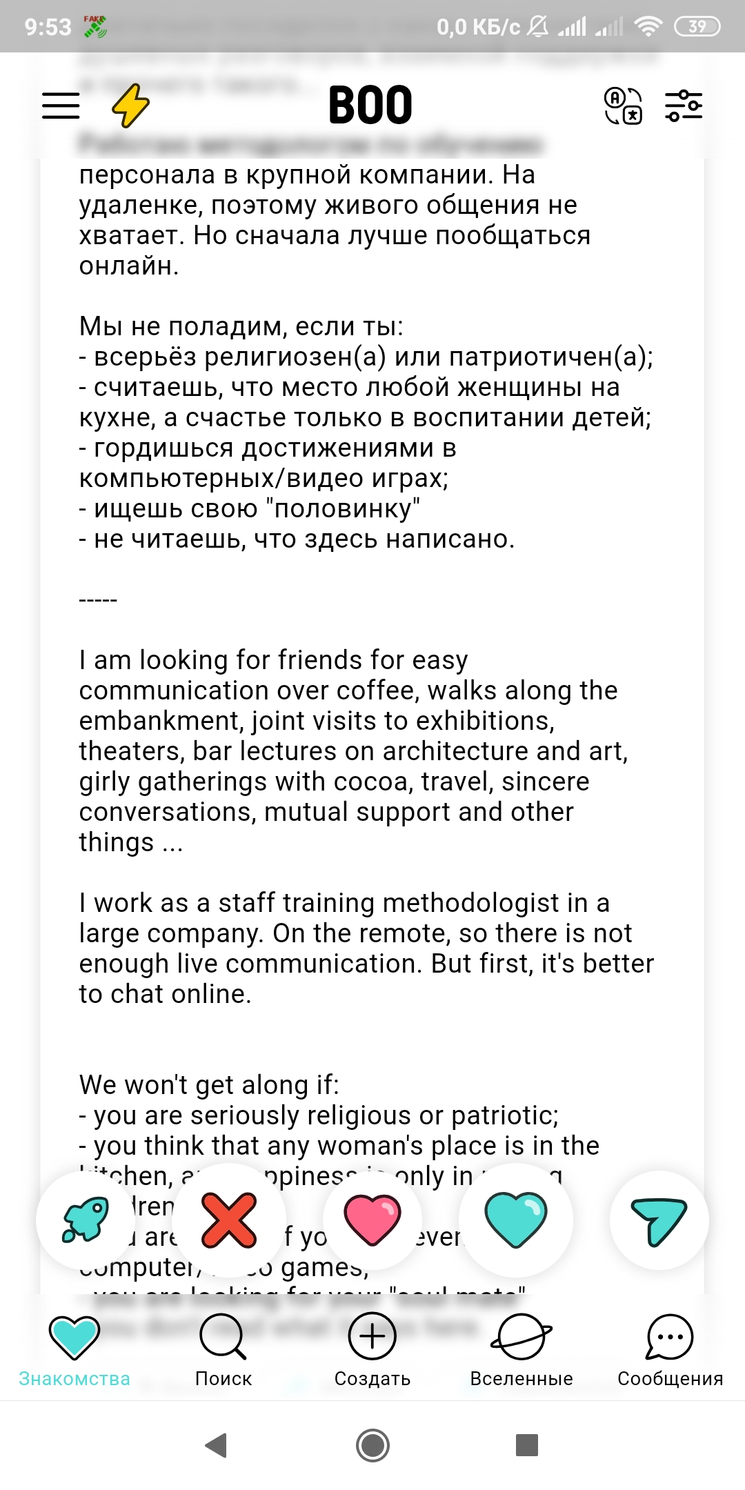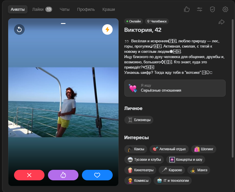 >>10323303 Нет, я видел ещё норм анкеты, такие, с которыми раньше у меня задавалось неплохое общение. Просто странно что ни единого лайка от них. Да и просто иногда лайки прилетали, хоть и от явных скаммных анкет, но всё же. А щас полный ноль! Значит теневой бан