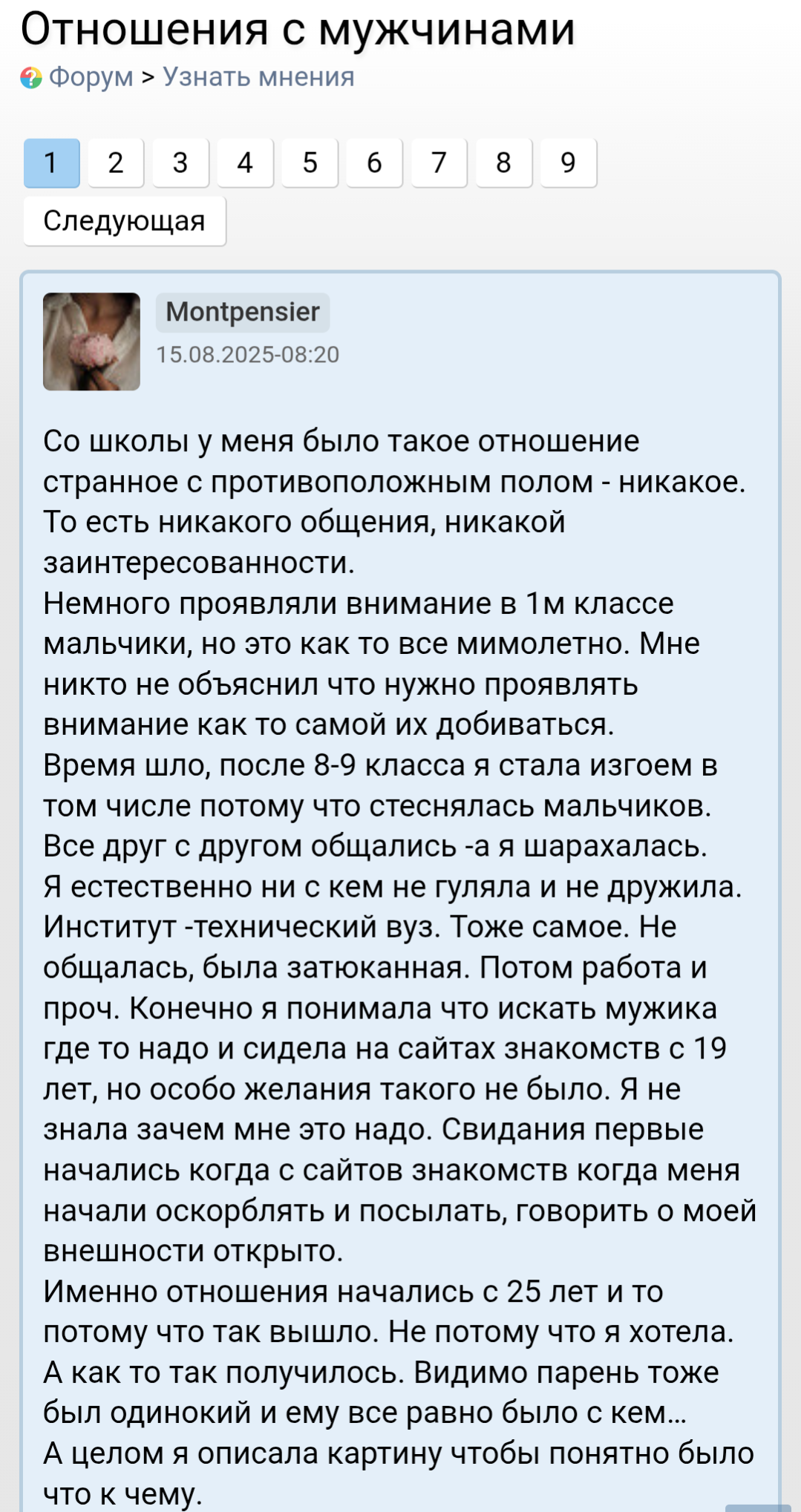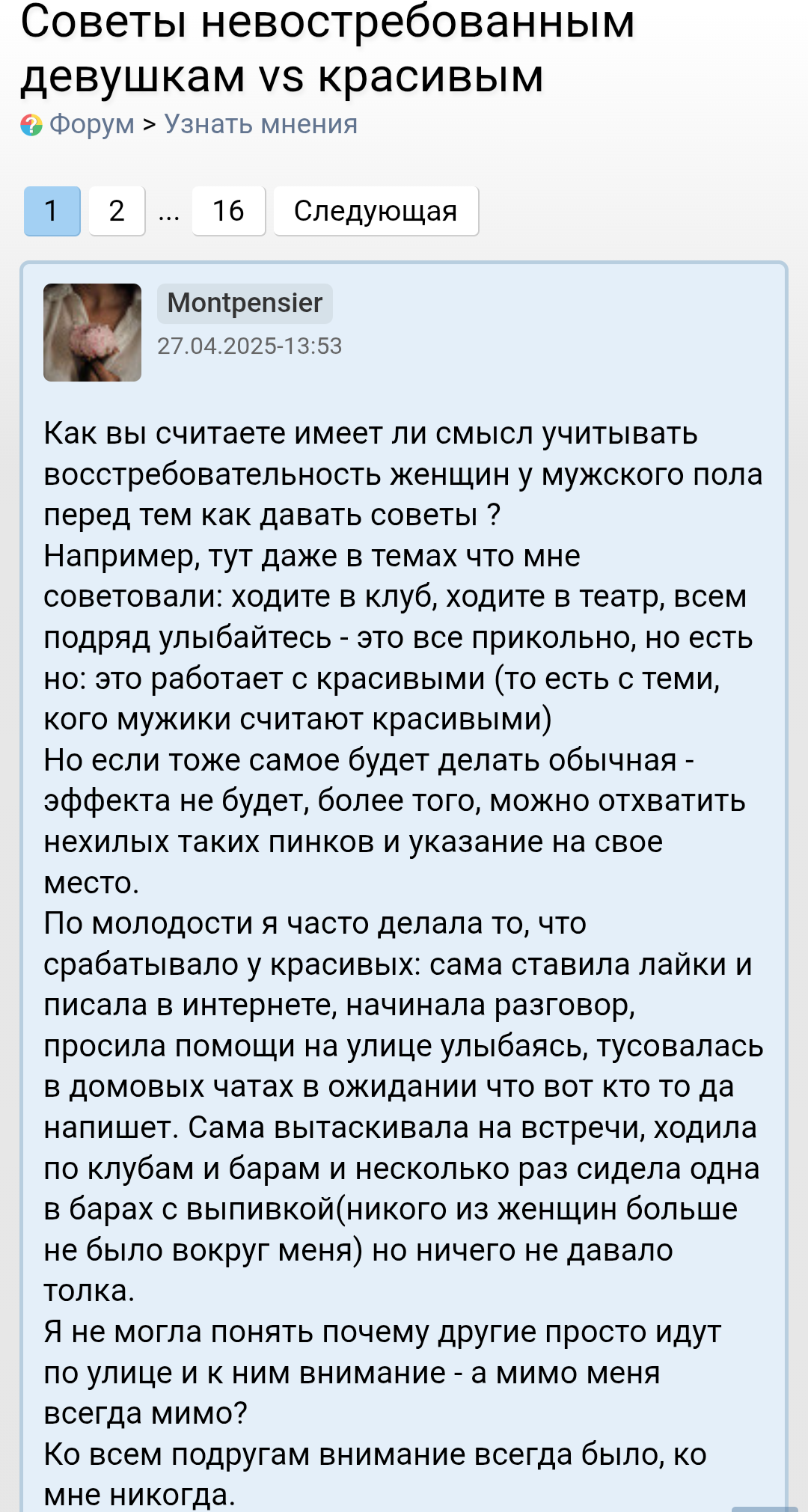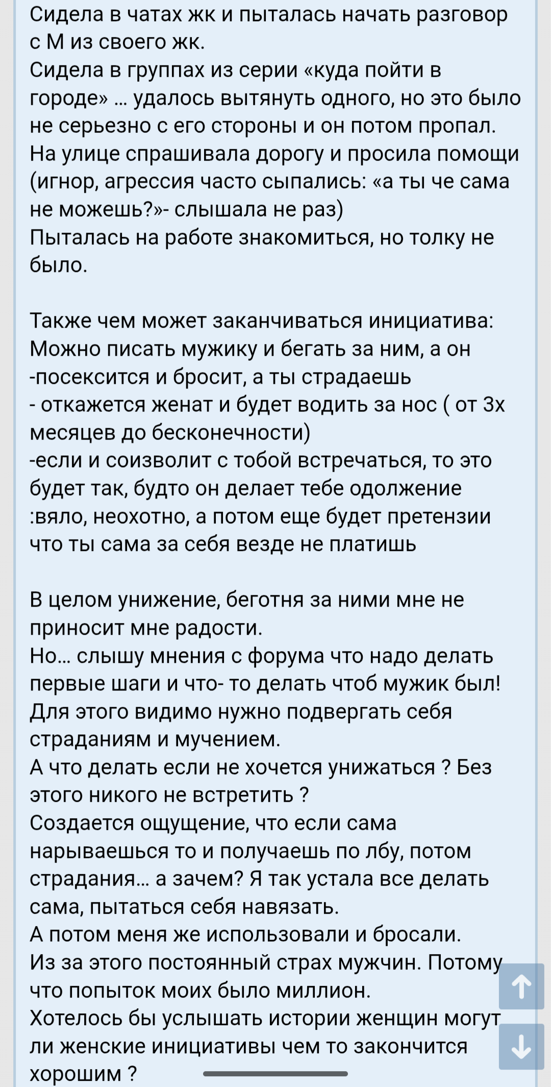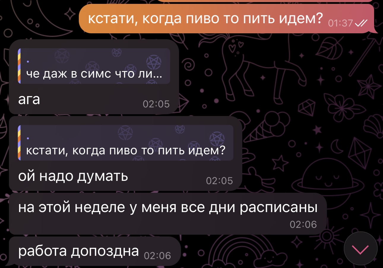 >>10322525 >>10322527 Мило пообщались 2,5 часа поговорили, пообнимался, чувствовал сердцебиение и её дыхание через сиськи, лёжа на коленях. Потом меня как мать понесла к остановке, потому что видите ли пить не умею сказала. Раньше я бы сразу вскрылся, как увидел этот чс. Но сейчас я понимаю, что это просто баба, таких много.. Зачем пиздострадать? Это и так вторая за неделю с кем пиво пошёл пить - ещё найду. Однако меня беспокоит конверсия, я легко и не принужденно переписываюсь и потом зову на созвон. Там если уже созвон есть - всё вытащил. А есть такие, которые не хотят разговаривать по телефону - и я понимаю что их в утиль нужно, потому что она не заинтересована и её вообще не получится вытащить, сугубо даже по моему опыту. Но есть вариант какой то, пойти погулять с такими?