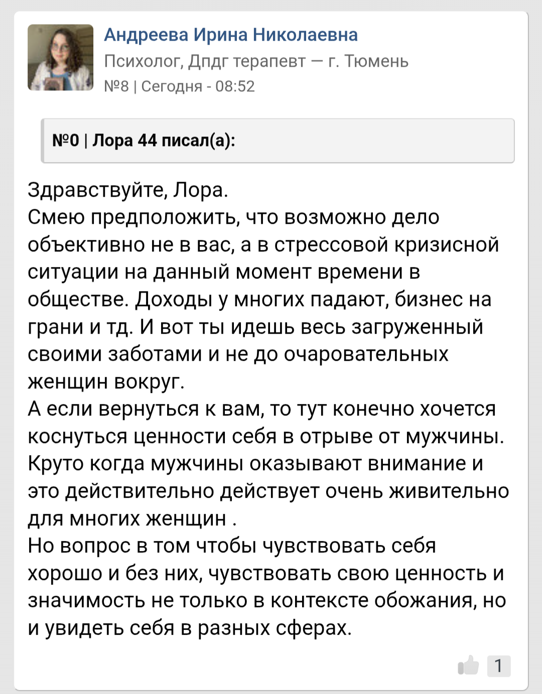 Но тут поправка, что я не переживаю из-за своей девственности как таковой. скорее меня кроет от того, что у меня в мои годы нет и не было отношений, нет родного любимого человека который бы встречал дома и придавала мотивацию жить и работать дальше