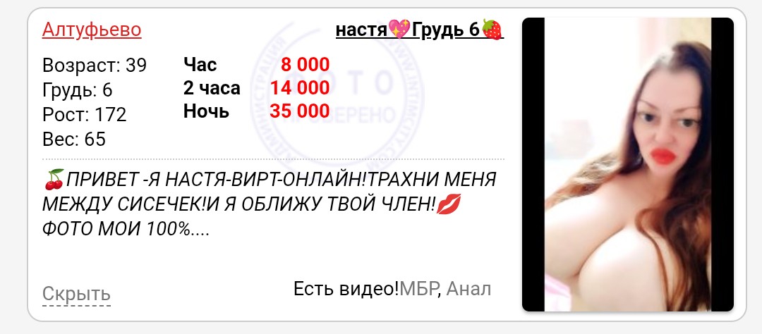 Тут в одной анкете: >снова с Вами, мои любимые мужчины🥰 >Вернулась и безумно соскучилась по вам https://f.intimcity.golf/indi/anketa776138.htm Так пишет, словно это что-то всенародно известное типа Тигры или легендарного Сухарика. Кто-нибудь знает, что это за чучело? Или чисто маркетинговый ход? ЗЫ: И как им самим не стрёмно так занижать возраст?! Я бы со стыда сгорел писать "26" при таких фотках в анкете. Я ещё могу как-то понять, когда занижают возраст титаническими усилиями приведшая себя в охуеную форму Соня с Профсоюзной или "маленькая собачка до старости щенок" Алиса с Алексеевской. Они заслужили и реально стараются соответствовать. Но тут потасканная шмара, которой корячится скоро сорокет и это по ней видно даж при студийной съёмке, пишет себе в анкету минимум -10 лет... Ну позорище же.