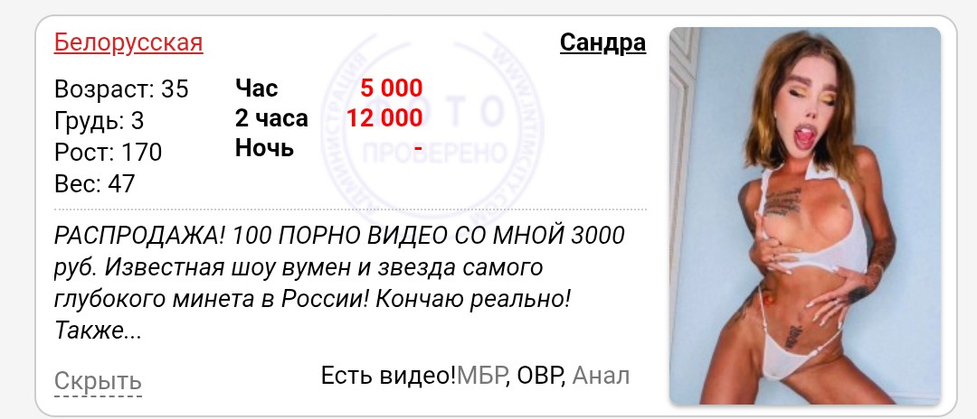 https://a.intimcity.guru/indi/anketa619660.htm Бывал кто у этих ? Не просто дешево ) Но еще и оценки годные! Плюс отзывы интересные.. Якобы может предложить сестру на жмж, а после и еще другие клиенты подходят на групповуху))