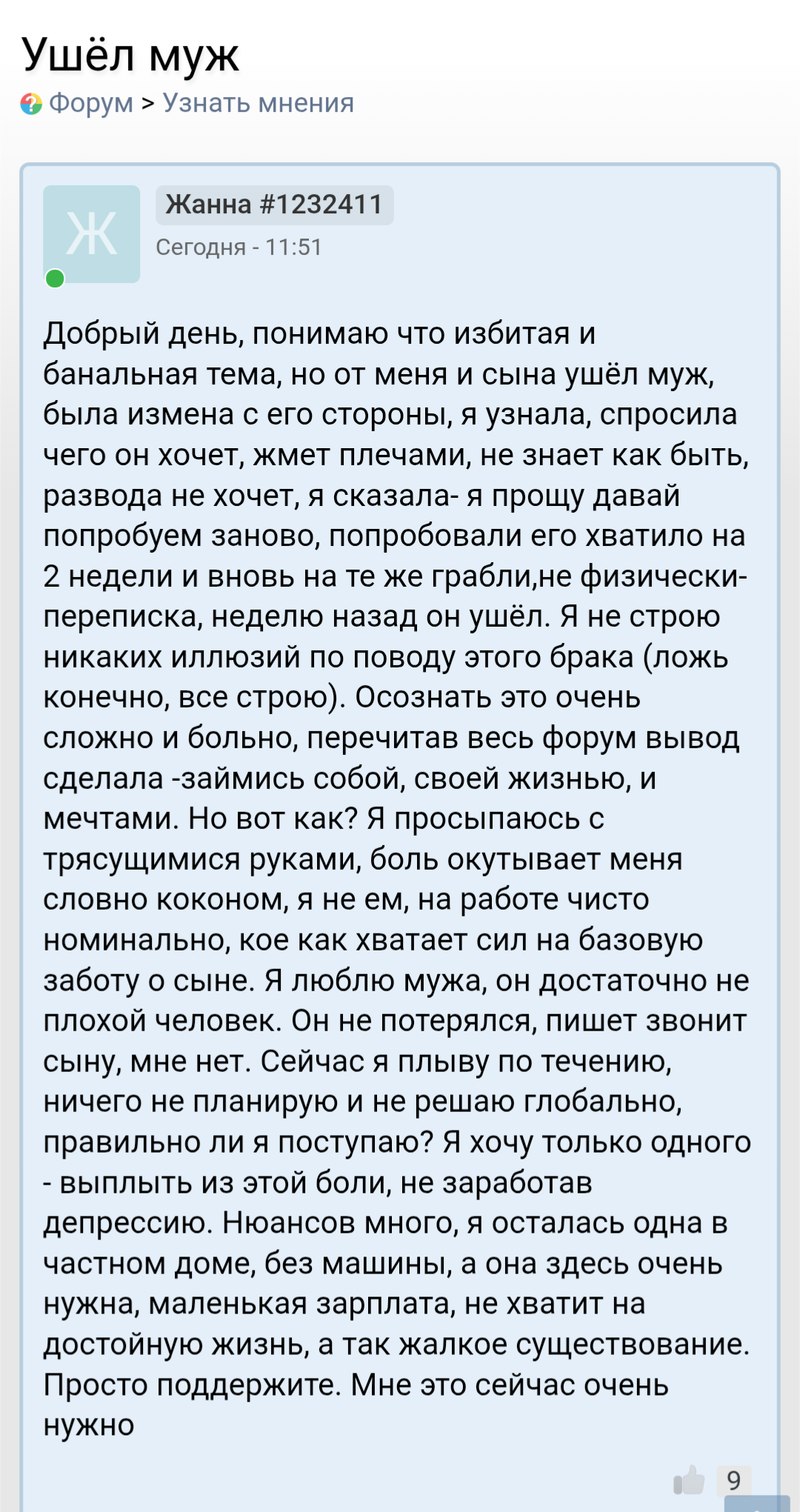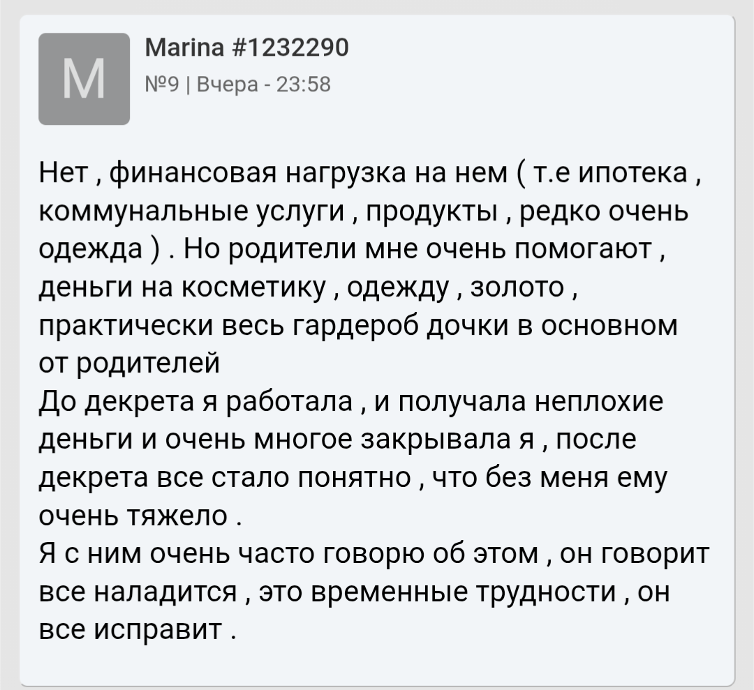 >>10329050 На прошлой работе была Катька. Первые отношения с будущим мужем у которого еще и ребенок от прошлой, лол. Родила ему двоих, чтобы на гойду не забрали, денег стало не хватать и муж пошел в росгвардию, Катька переехала в Тверь к мамке, так как аренду не тянули. У мужа работа сами понимаете, не продохнуть и выходных мало, да еще и кататься. Охладела к нему и написала мне, что совершила ошибку и я был бы лучшим выбором.