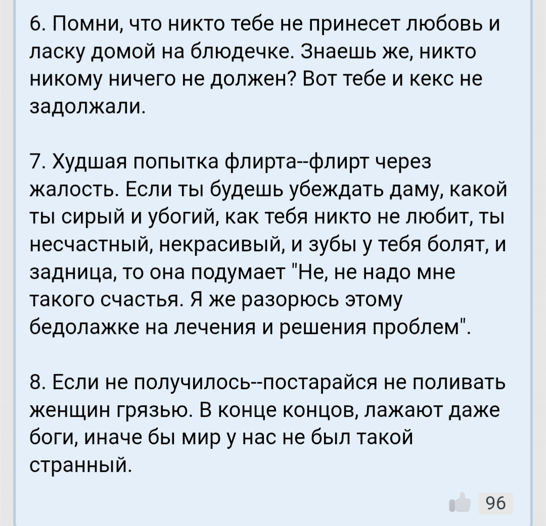 Ну я допустим 5-6 он э гуд дей, а бывало подкатывал к шмаре 2-3 из 10 (с какого-то перепугу решил что "ну зато она кажется человек неплохой" ебать как же я ошибался)