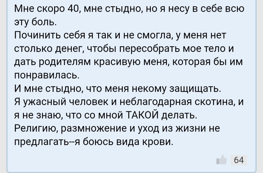 Что касается пластической хирургии, тут ведь какое дело, если бы у меня прям уродства были какие, типа заячьей губы, ну я бы занялся этим вопросом, конечно. Но так-то лицо у меня обычное. Есть даже какие-то приятные женскому глазу фичи, про глаза вот например чаще всего говорили. А сделать из себя квадратноеблую хуйню - ну это уже не я буду. И вообще не должно быть такого пиздеца чтобы чел просто обычной внешности был неодушевленным предментом для 99% тней. Это изначально поломанная вселенная, дайте другую. Или ебитесь в рот, мне уже все равно.