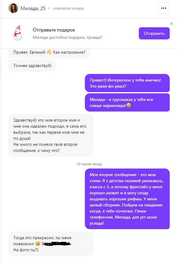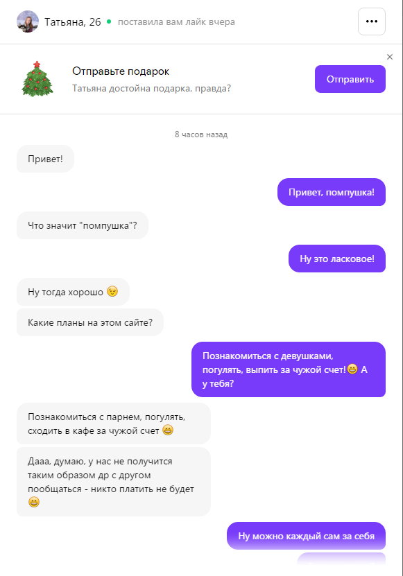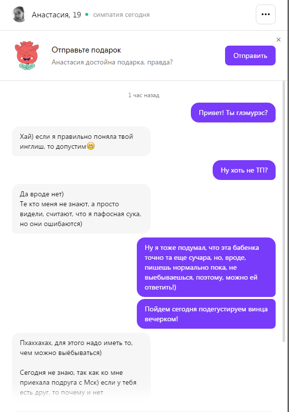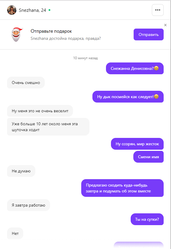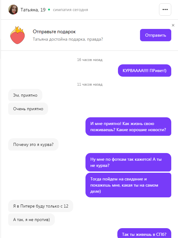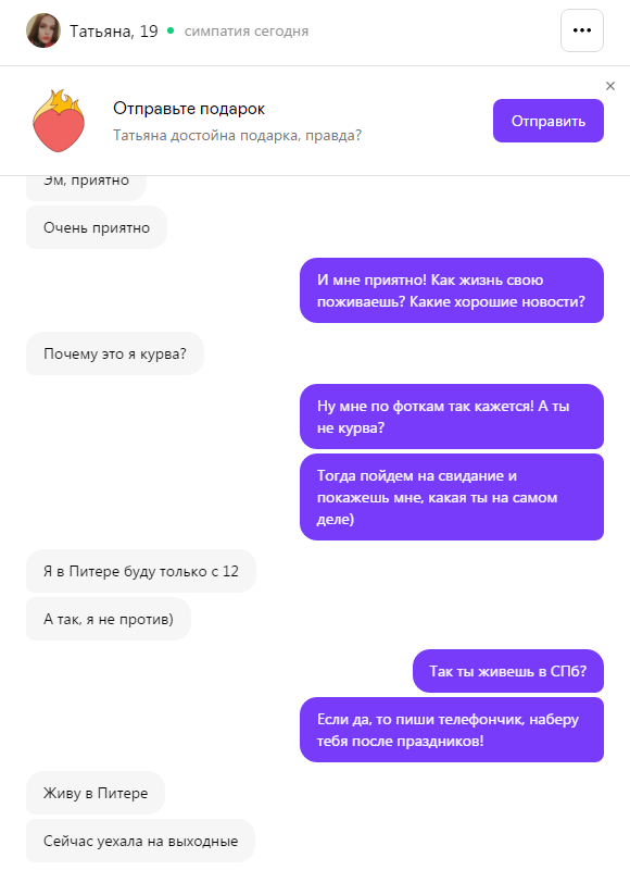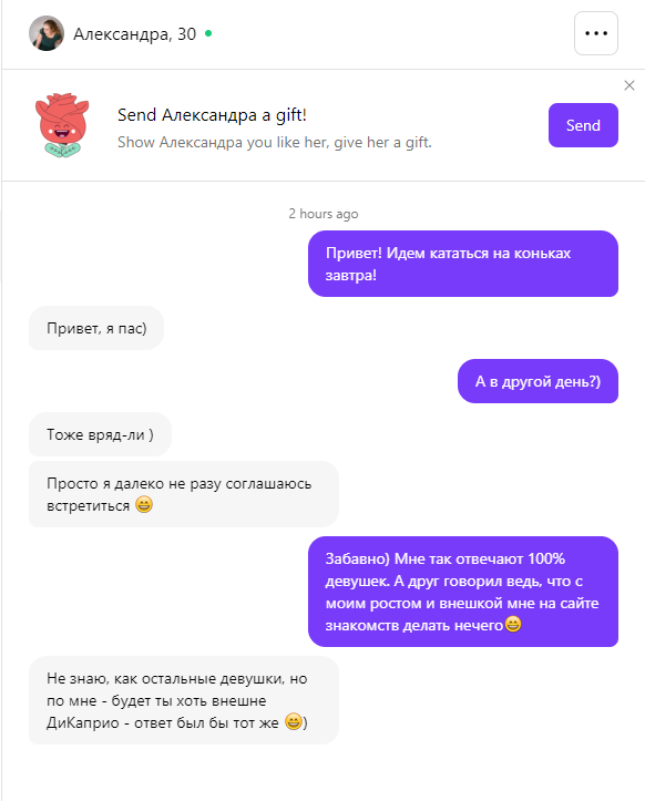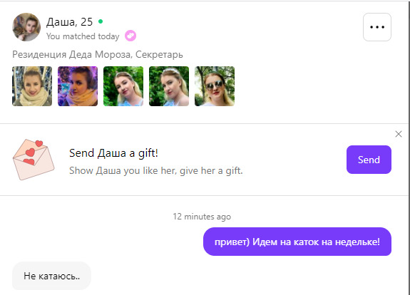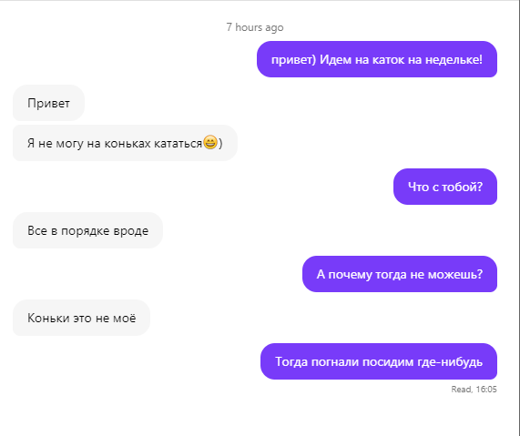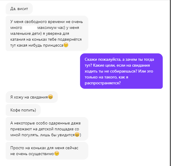 Вкину своих старых скринов со свей реальной анкеты, чтоб на контрасте с переписками с фейка Татарина Зимой не помню какого года уже, пытался найти себе кого-нибудь, чтоб покататься на коньках. Так никакого не нашел за всю зиму. Написал 250 девушкам и женщинам, большая часть не ответила, а те немногие, что ответили не согласились