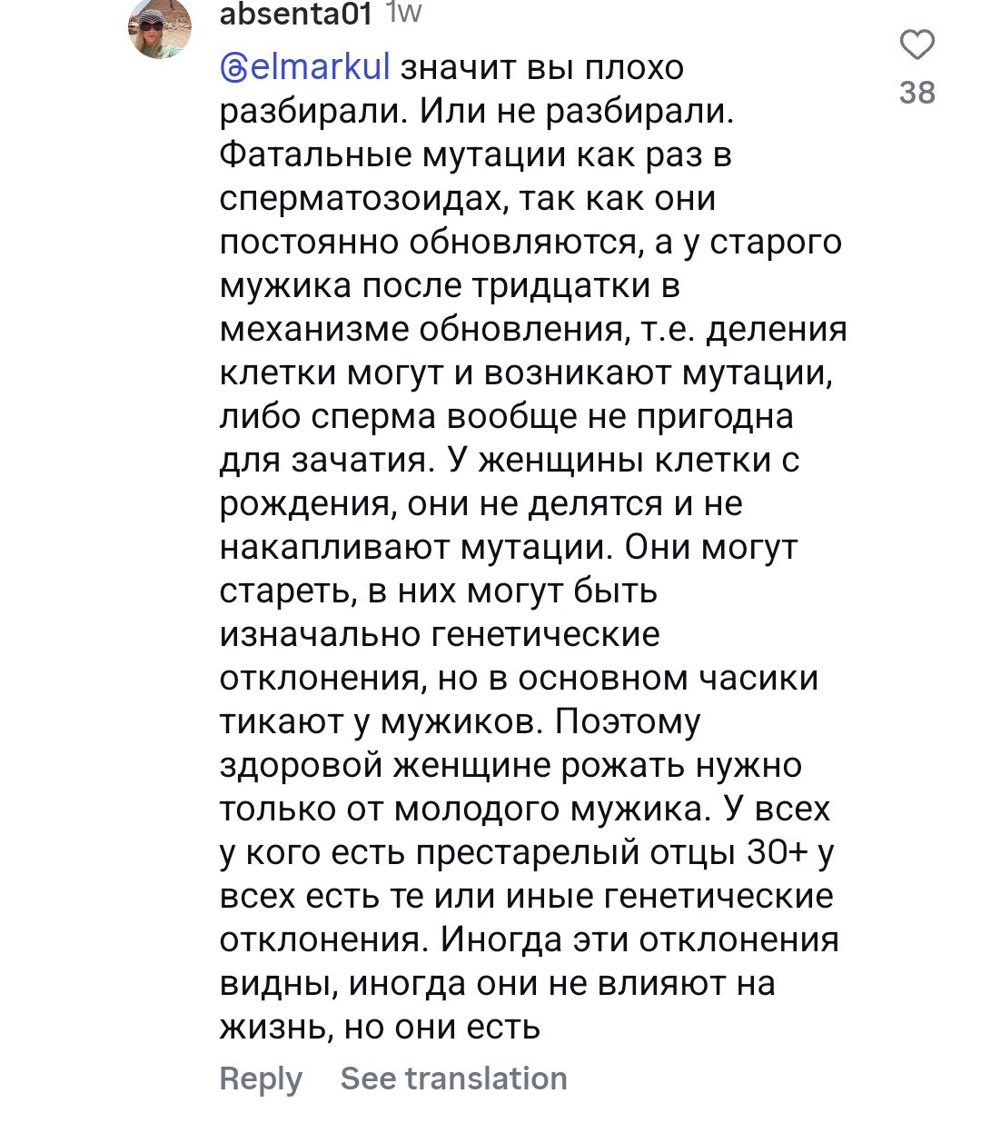 >>10338246 У мужчин как раз из-за того что сперма обновляется все лучше. Они могут курить/бухать и тд, потом восстановится. Ну конечно с возрастом и у кунов хуже становится, но не так сильно. Если сперма постоянно обновляется, то мутации и у 20 лвл куна могут возникать - там от цифры в паспорте это мало зависит, это смотря какой изначально кун. 6'2 инцел на хардмаксе
