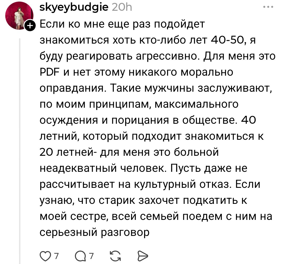 И вот тут возникает закономерный вопрос, который так бесит мужскую аудиторию. Если я плачу за себя сама, зачем мне нужен мужчина, который старше, но при этом не предлагает ничего, кроме своего возраста?