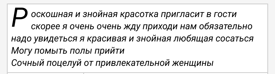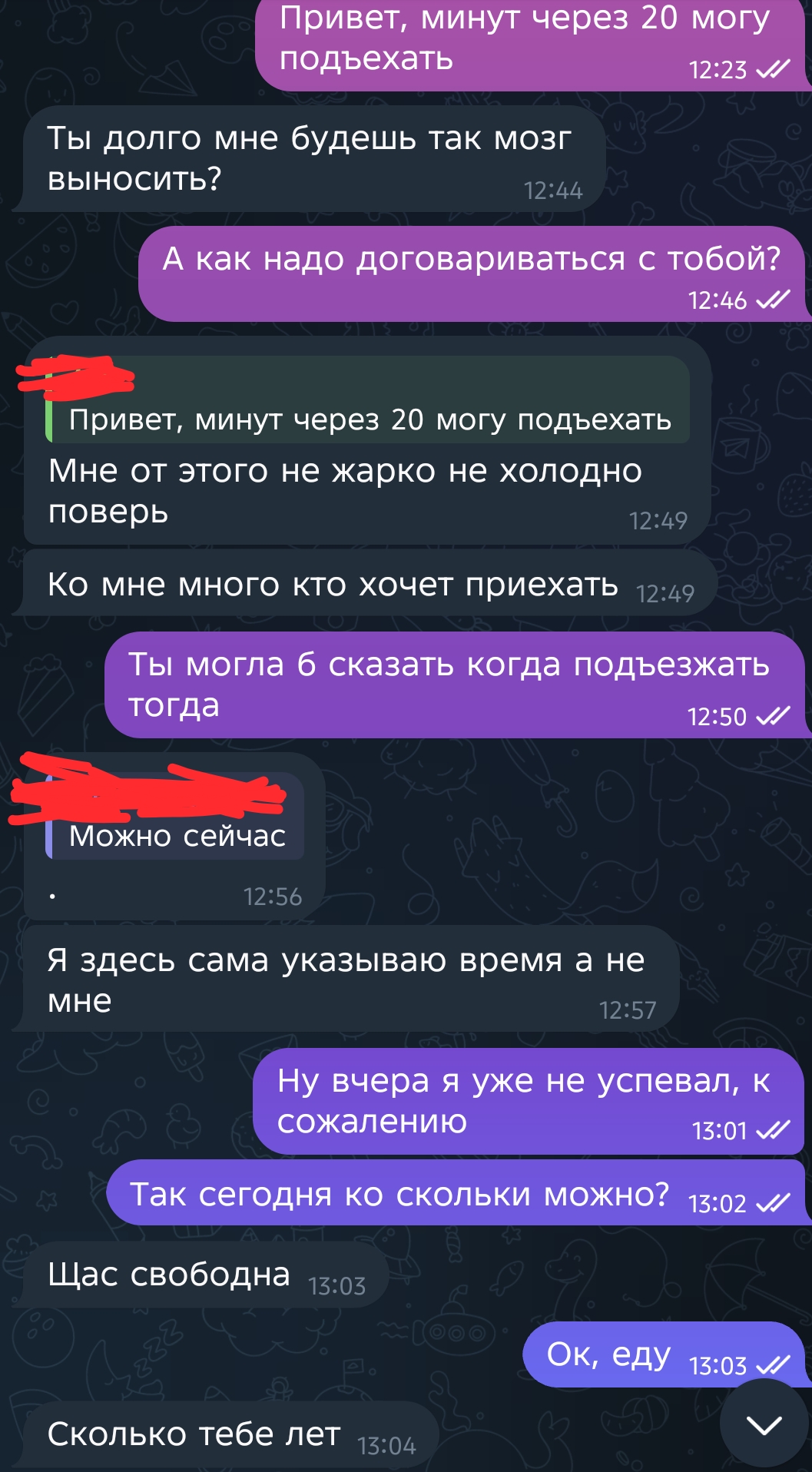 Мда, анончики. Влажу в эту тему максимум раз в несколько лет, когда захочется свежего мясца прямо сейчас, а моральных ресурсов на знакомство нету, да и не быстро это. Выбрал вот эту https://end.intimcity.guru/indi/anketa775678.htm Прям мой типаж по фото. Идеально чтоб закрыть гештальт по зумершам. Списались, договорились о времени. Я мчу через пол Москвы на своей колеснице. Приезжаю-двор за шлагбаумом, парковки нет рядом нихуя. Пишу ей, что я на месте, интересуюсь, где машину бросить. Через 5 минут до времени отвечает: Извини, форс мажор, не получится. Прости что так поздно предупредила. Я в теме нуб и за тредом не слежу. Это частая ситуация вообще? Кто то у неё был или это фейкота какая то. Тогда смысла не понимаю. Честно говоря, потраченного времени жаль.