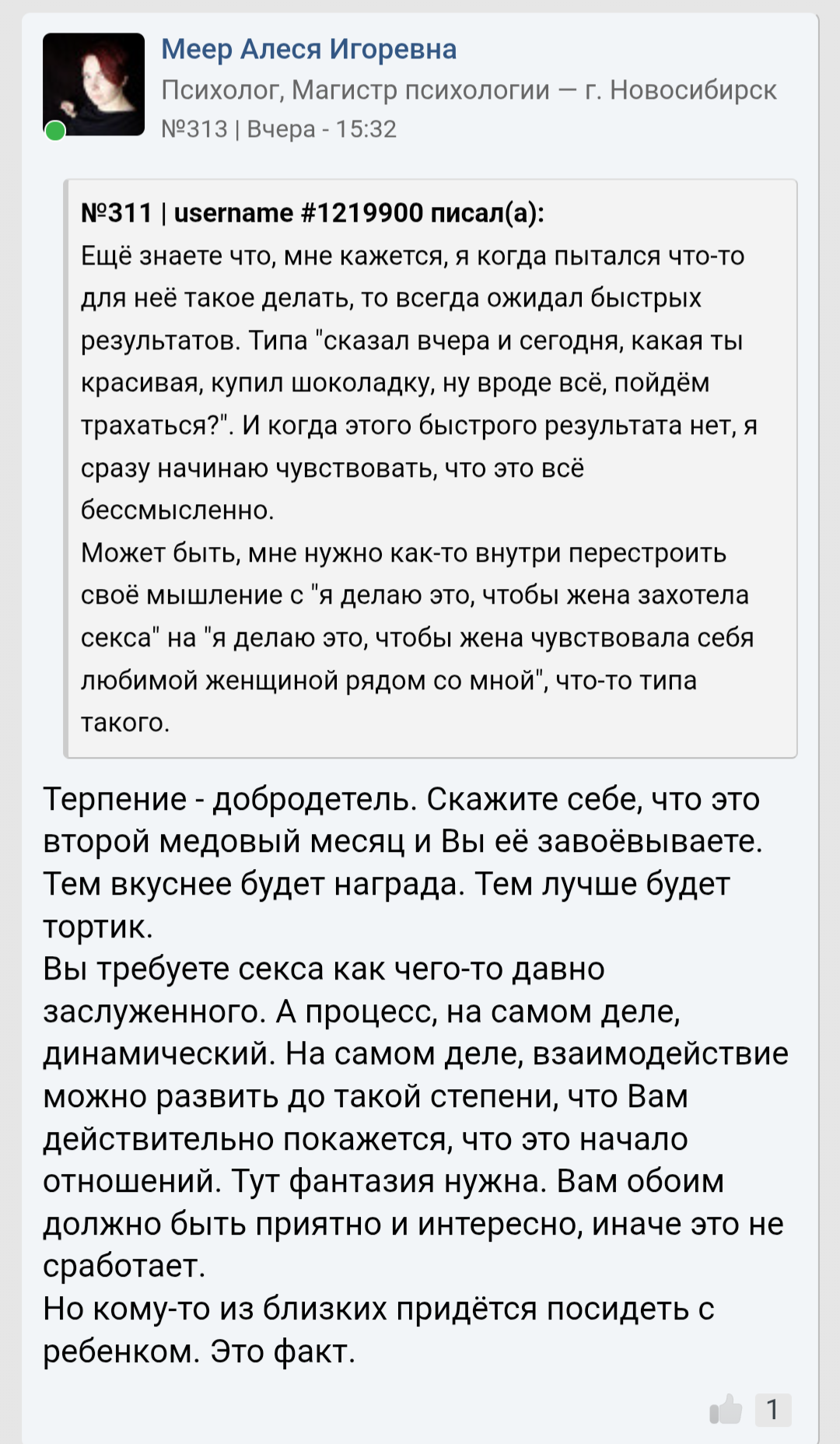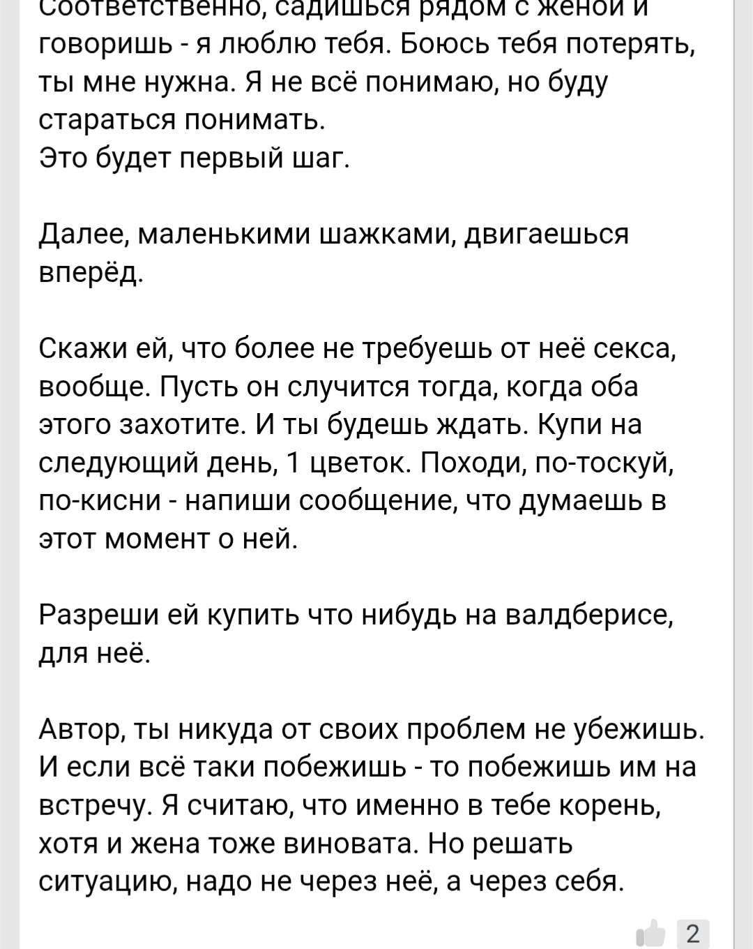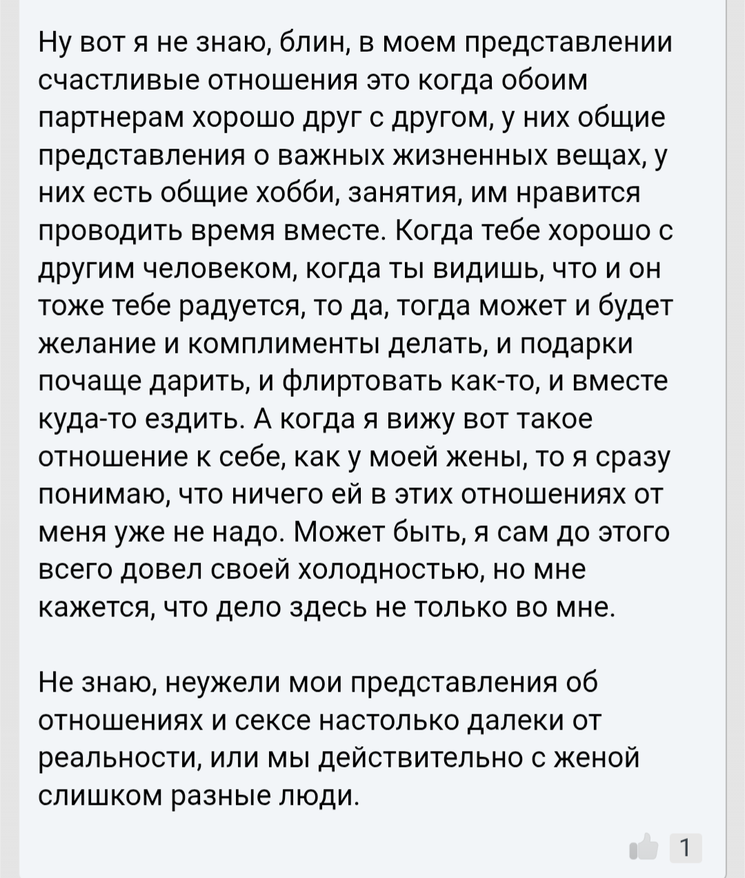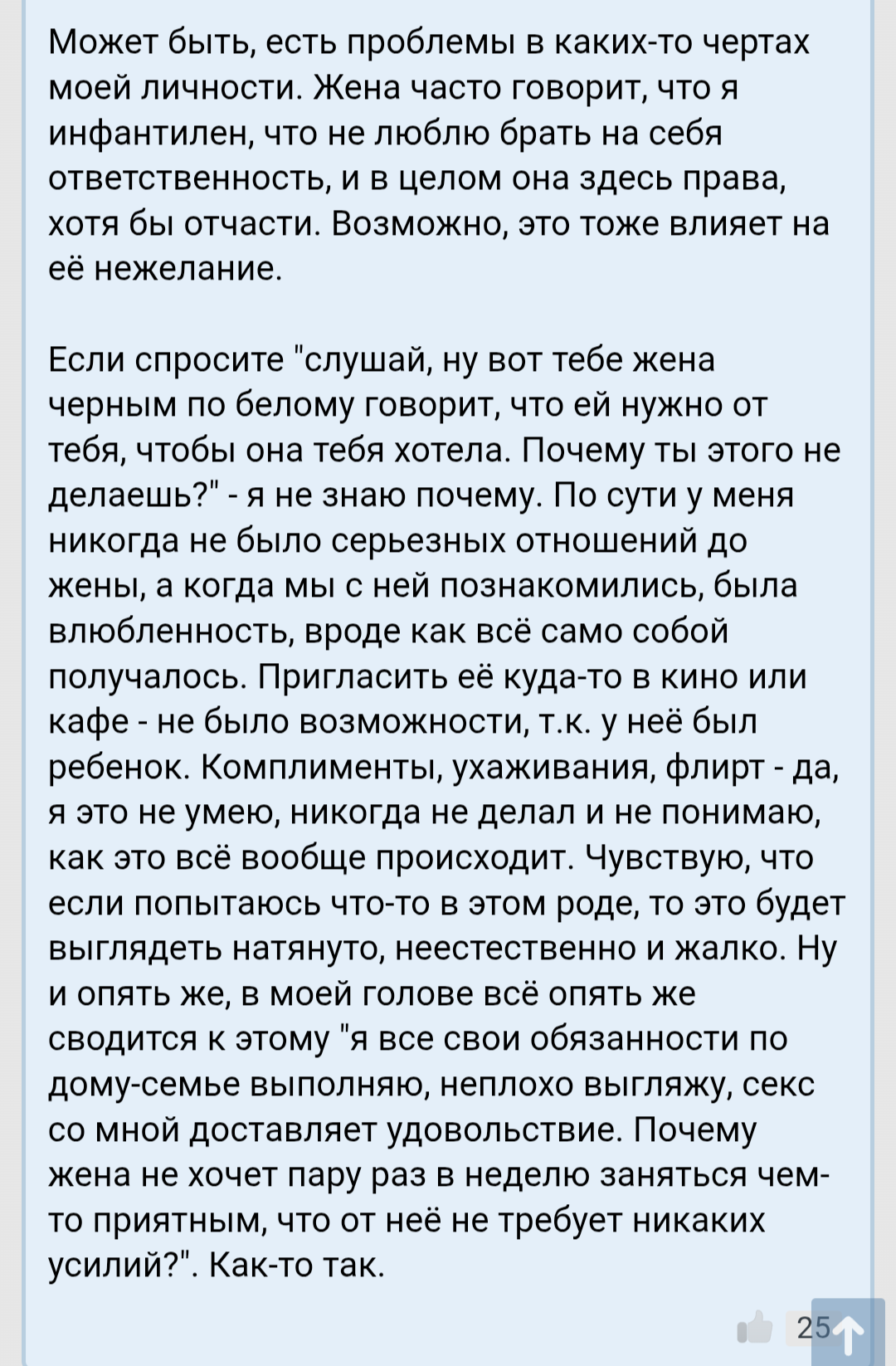 Интересно, он так никогда и не поймет, что его проблема не в том, что эта женщина - не та, а что любая другая будет поступать с ним точно так же? И ему за всю тему всего лишь пара человек сказали, в чем на самом деле проблема, а остальные пишут, что ему надо жену радовать, дарить подарки и делать комплименты, тогда и секс будет