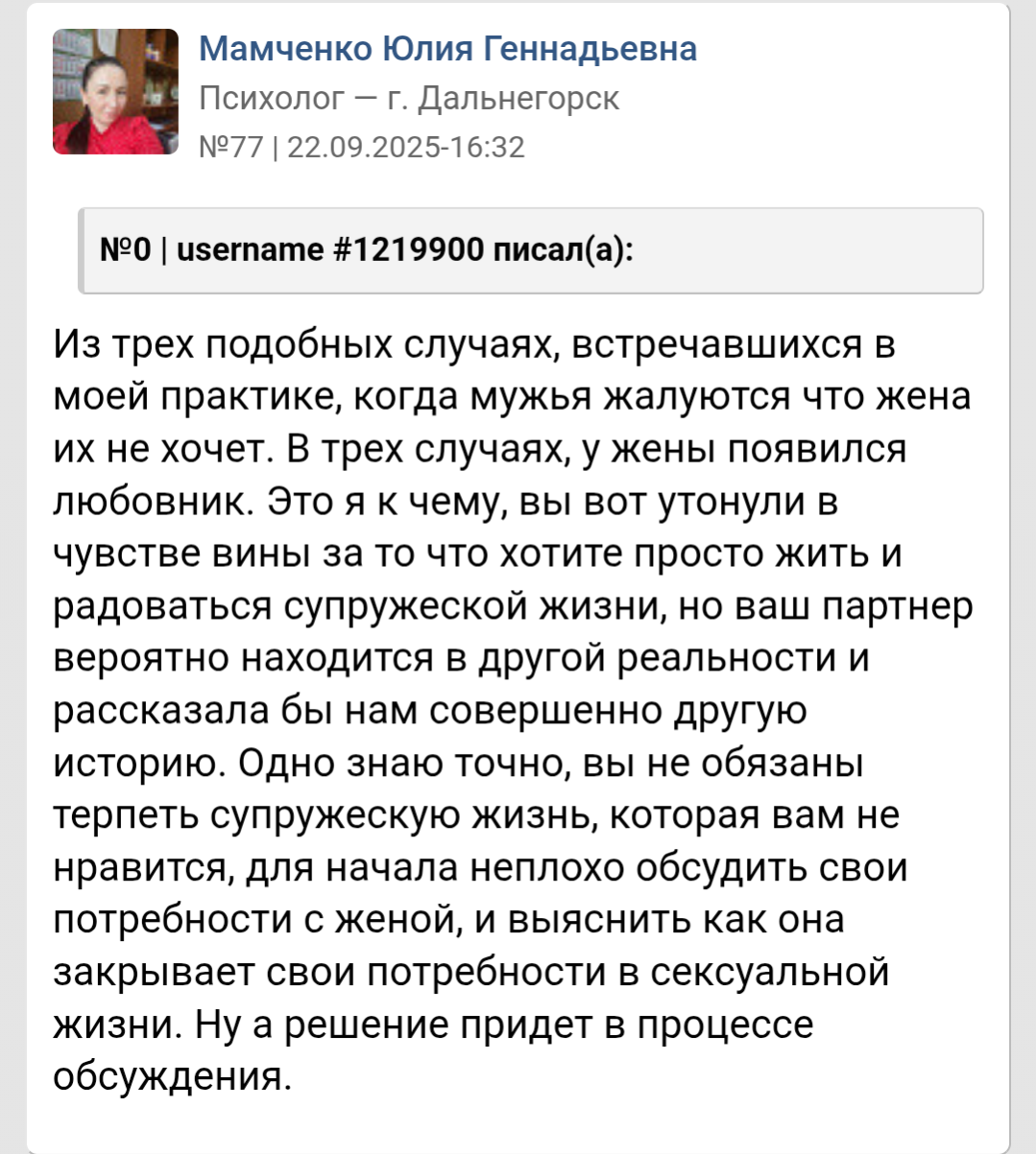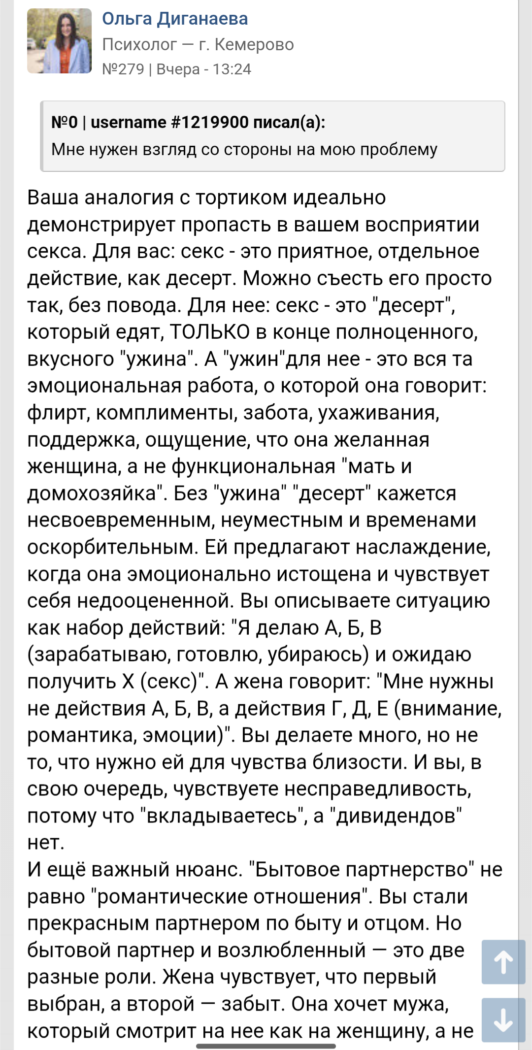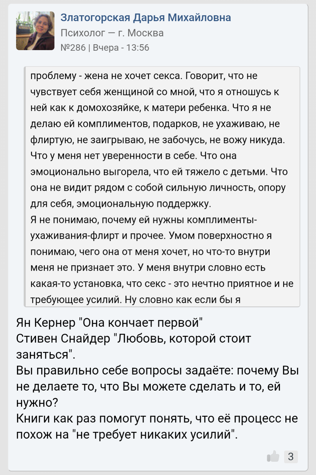 Интересно, он так никогда и не поймет, что его проблема не в том, что эта женщина - не та, а что любая другая будет поступать с ним точно так же? И ему за всю тему всего лишь пара человек сказали, в чем на самом деле проблема, а остальные пишут, что ему надо жену радовать, дарить подарки и делать комплименты, тогда и секс будет
