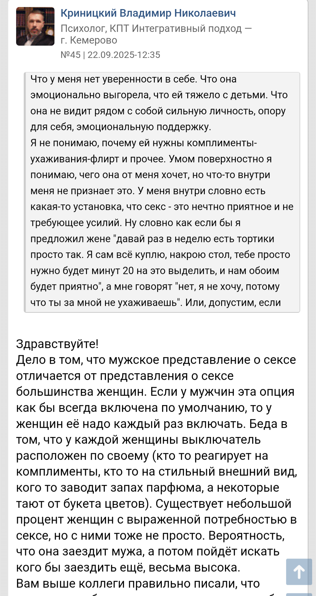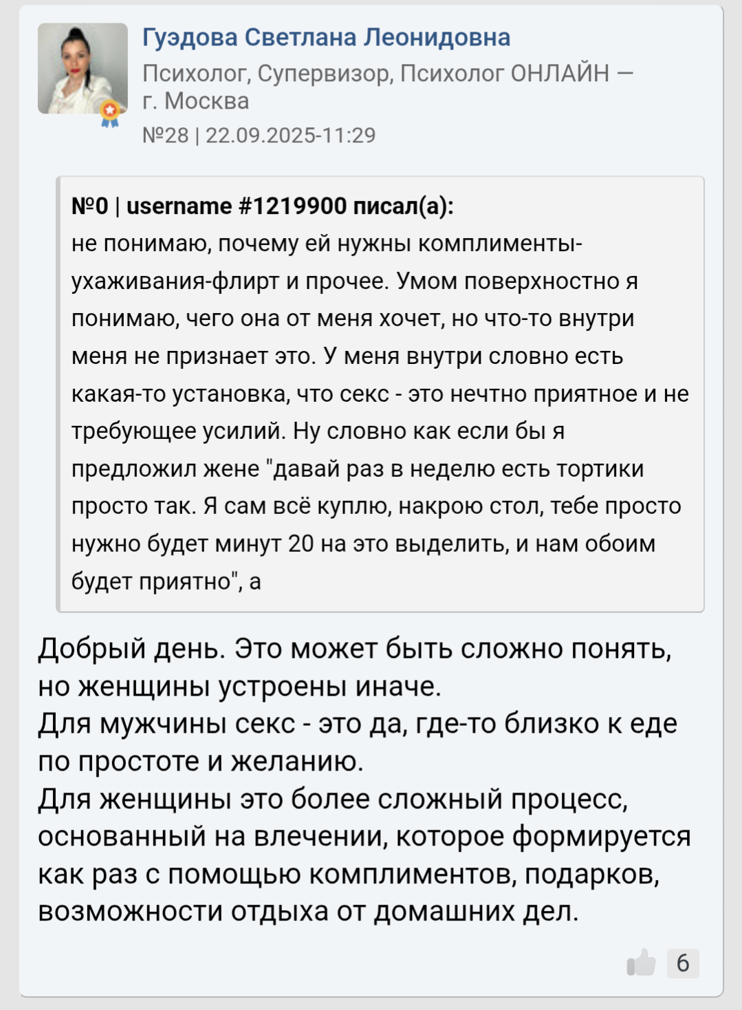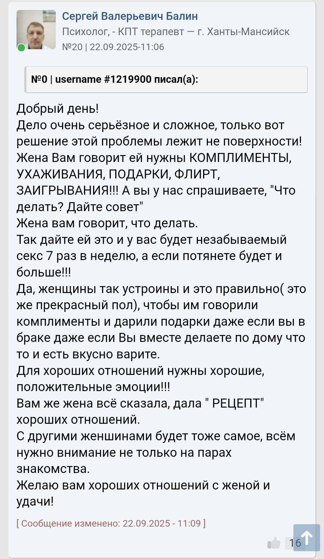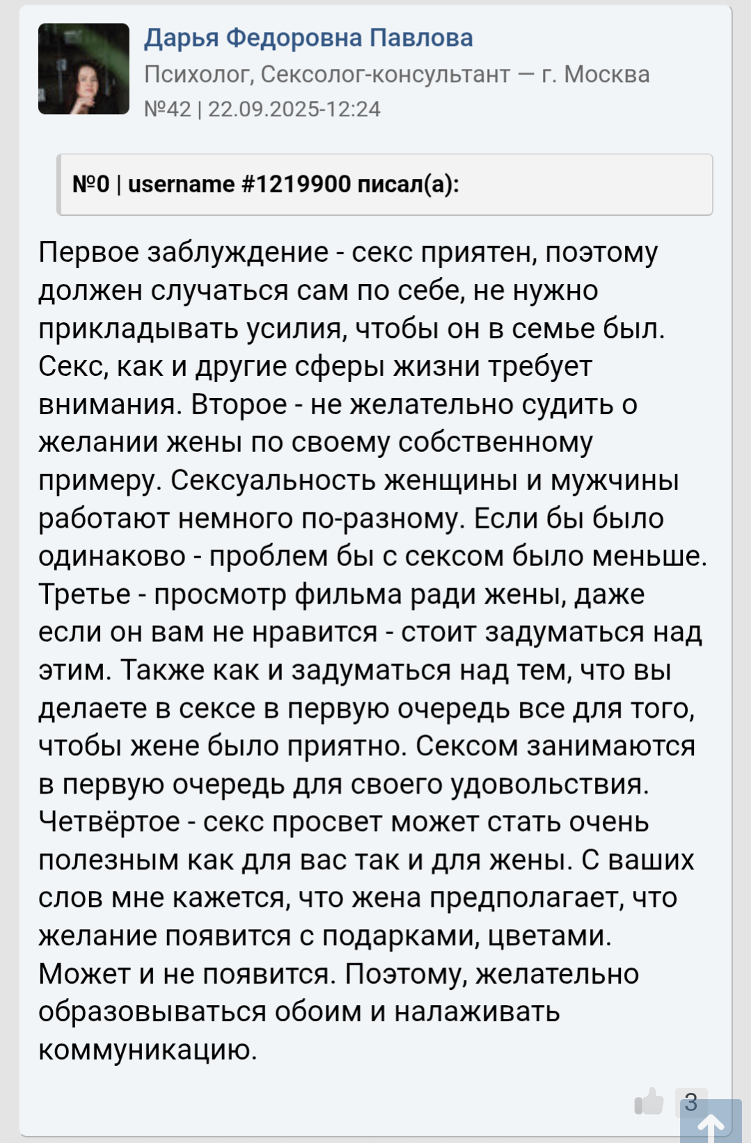Интересно, он так никогда и не поймет, что его проблема не в том, что эта женщина - не та, а что любая другая будет поступать с ним точно так же? И ему за всю тему всего лишь пара человек сказали, в чем на самом деле проблема, а остальные пишут, что ему надо жену радовать, дарить подарки и делать комплименты, тогда и секс будет