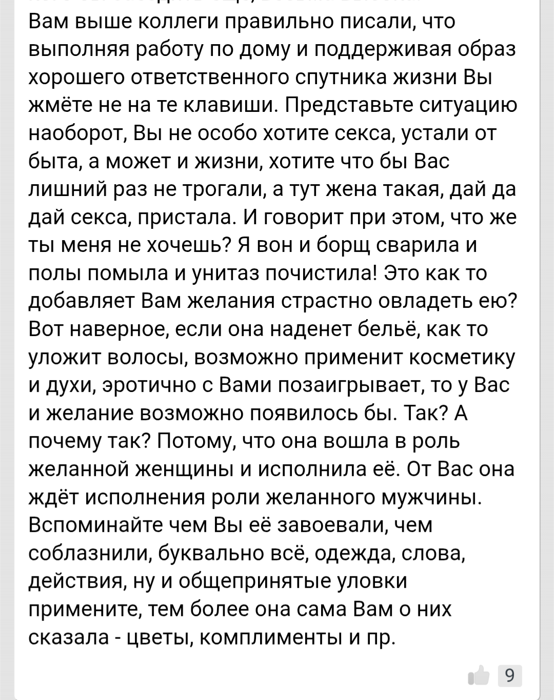 >>10344663 А разве секс - это не взаимное удовольствие для двоих? Как же тогда так выходит, что мужу, даже не просто парню, а мужу, нужно его добиваться? Как будто работа какая-то для женщины Чет, я нихуя уже не понимаю