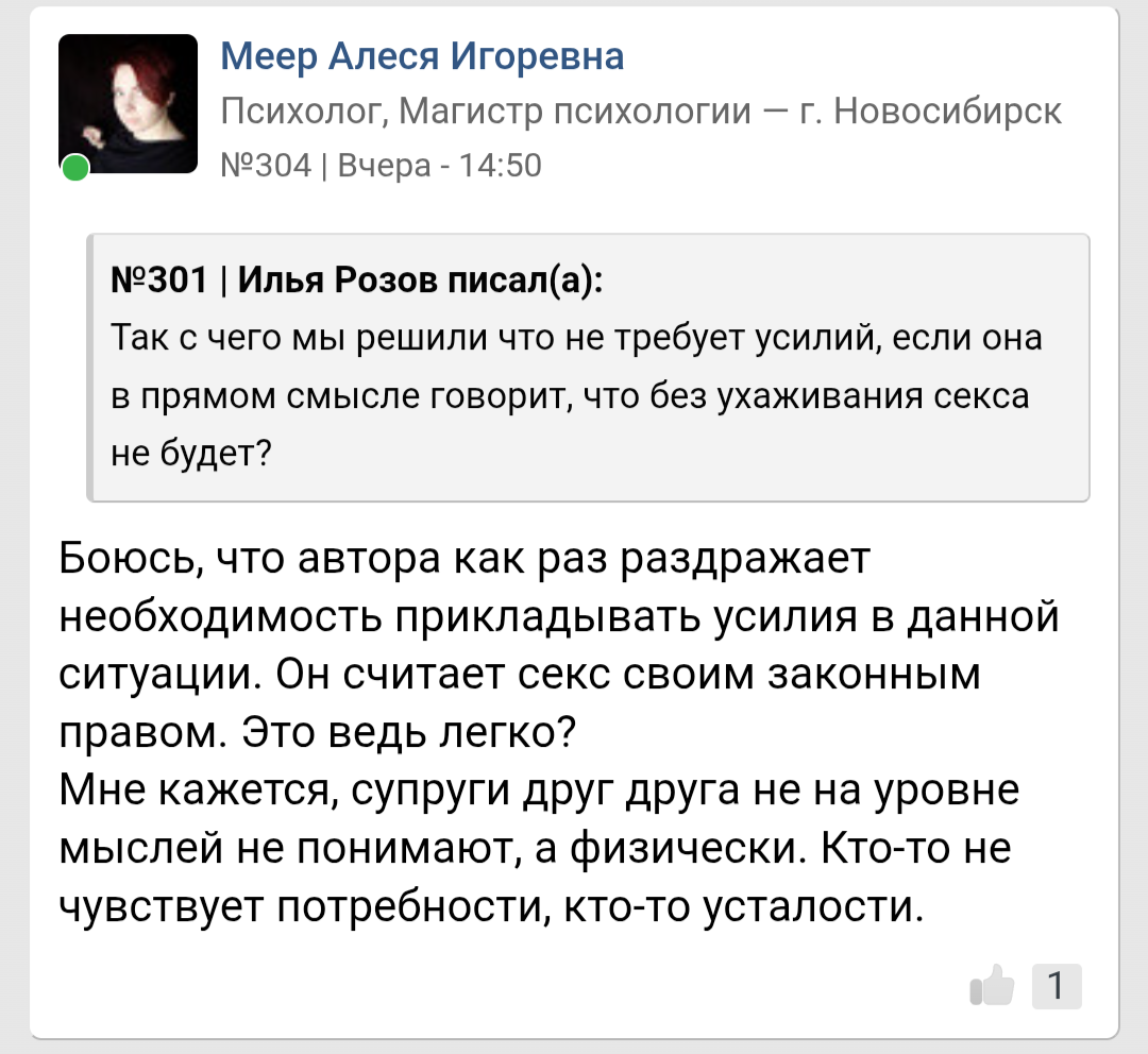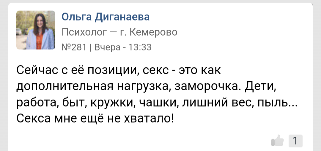 Прикиньте, вы работаете, платите ипотеку, сами себя обслуживает, занимаетесь ребенком, причем, один из них даже не ваш, и вам же ещё нужно заслужить секс!! У меня это в голове не укладывается