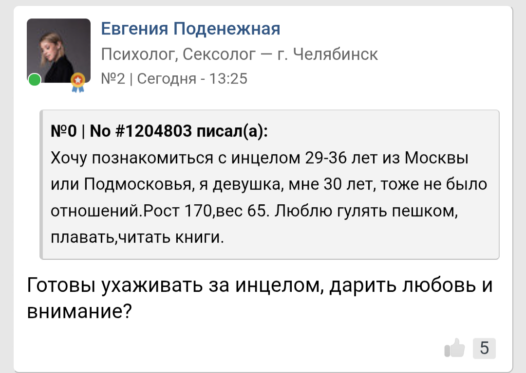 Ну вот я лично считаю что за такое надо выписывать из инцелов и человеческой книги вообще, и откуда только в вас столько гонору то ёпта. Году в 2006, когда я ещё не был инцелом (тк секс тогда ещё не отменили), я как-то раз ходил со своей девушкой в мусарню, ей надо было заяву накатать, тк у нее в маршрутке спиздили телефон. И там пока я ждал на крыльце, ко мне осторожно начала клеиться девушка, которая только откинулась с зоны (она принесла справку об освобождении). Единственная причина, по которой я отморозился - что был юн, занят и благороден. В мыслях не было никакой хуйни типа она сидела а я нет значит я такой весь мамин пирожочек а она чикотила подзаборная. Поэтому я по сей день имею право быть уверенным что в своем инцелибате я никак не виноват, я всегда к селёдкам со всей душой. А инцелом стал потому что случилась гиперинфляция пизды