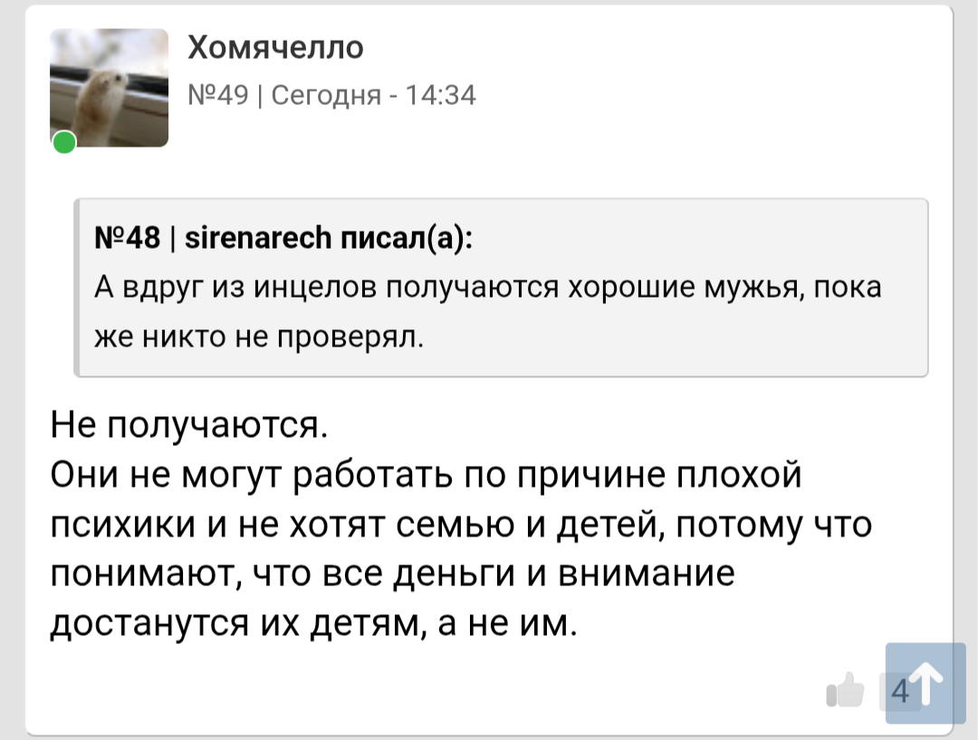 >А инцелом стал инцелом стать нельзя, "держался за ручку - не инцел", а все остальное копиум и и попытка снять с себя ответственность.