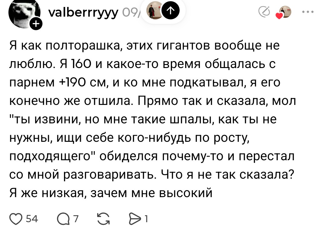 >>10351848 Неудивительно что под постом всего 15 лайков, было бы наоборот ,что предпочитаю только 190 см шпал, лайков было 200 как минимум, то есть тян которым не важен рост в меньшинстве. Итс овер.