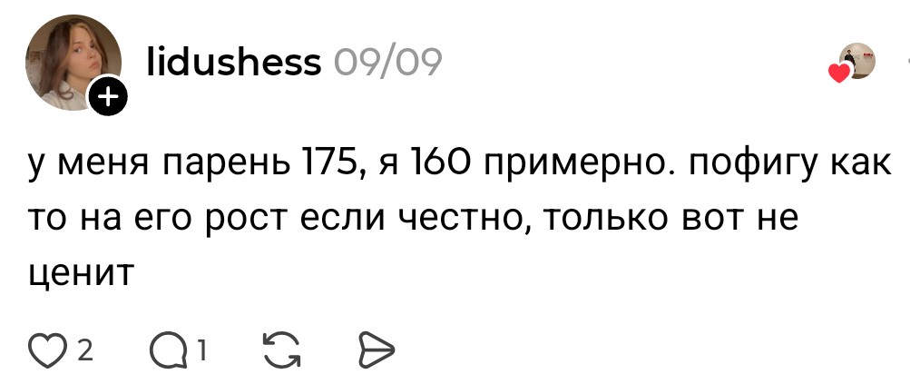>>10349546 Нахуя сам себя унижаешь? Она отвечает норм, а спизданула дефолтно сначала, но при общении дальше эти пару см уже не будут играть роли, сама говорит за чувства, она 160 ты для неё и так на 16 см выше