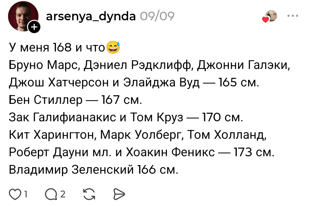 >>10350632 Ну так смотри ты сам себе противоречишь. Если у всех 185, то рост перестаёт быть фильтром, и реально идёт отбор уже по лицу. А раз так, значит решает именно лицо, а не рост. Ты же сам это расписал, только вывел наоборот. Рост максимум даёт "входной билет" чуть проще пройти первый взгляд, но на этом магия и заканчивается. А дальше либо есть харя, харизма, умение себя подать, либо всё, сиди дальше с анонами. А твой аргумент про "карлика" смешной: если у него лицо мтн уровня, он и без 185 засияет. Просто ты не хочешь принимать, что рост не изимод, а временный баф. Иначе не было бы толп выше 185 в треде, которые так же сидят и жалуются. Где их "автоматические тянки", если всё решает сантиметр? А про ютуб и контент ну да, если у тебя ноль идей и ноль харизмы, то хоть 2 метра, хоть 3 ты просто фон. Зато чел с лицом и харизмой без всякого роста может собрать армию фанаток. Итог: рост — это как прокачка силы в рпг, но если харя и харизма в нуле, то ты всё равно нпс, сколько бы сантиметров ни навесил.