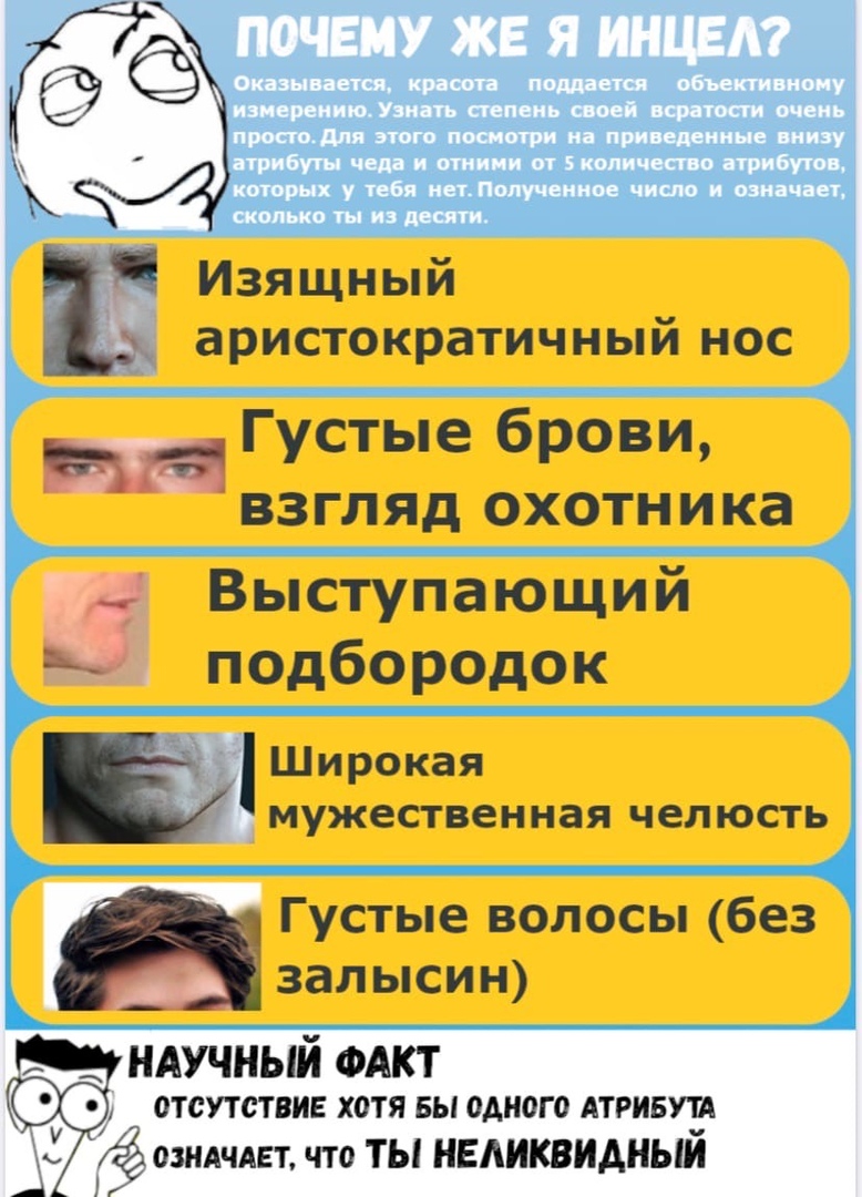 >>10336890 (OP) >лохов омежных Что в твоем понимании лох? Ты начитался инцелвики про темнотриадников что ли? >вы не представляете сколько я видел Ты видел то что хотел видеть, так наш мозг устроен, замечать только то что надо. На остальное ты просто не обращал внимание >ширина нижней челюсти >только нижняя челюсть Это можно пофиксить с помощью пластической хирургии >красивым омежкам не мешает омежность телок ебать и в социуме жить счастливо Это миф, не более. Будучи омежкой ты не сможешь выстроить взаимоотношение с тян, не сможешь влиться в мужской коллектив. Если у тебя цель просто выебать тян с последующим дропом тебя, то может быть, но нахуя это надо если есть шлюхи? >а если захочешь ебало набить - уважать тоже не начнут, просто отпиздят толпой потом и назовут психбольным Ахахах. Может и так, но если ты ебало набьешь то как минимум к тебе лезть лишний раз точно не будут а если толпой изобьют ты можешь заяву подать и устроить нападавшим веселую жизнь