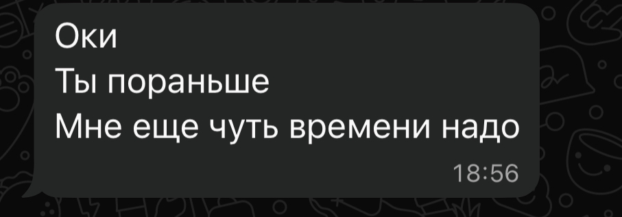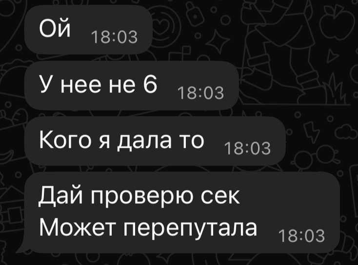 Хотел попасть к первой, пишет что работает до 8, а я не успеваю доехать к 7 Пишу в смене ли девочка завтра Спрашивает какая девочка? Я говорю которая на анкете работает, ты же диспа? Она с чего ты взял бла бла бла Я говорю блять я не первый раз иду и знаю как они работают Пишет ты не угадал)