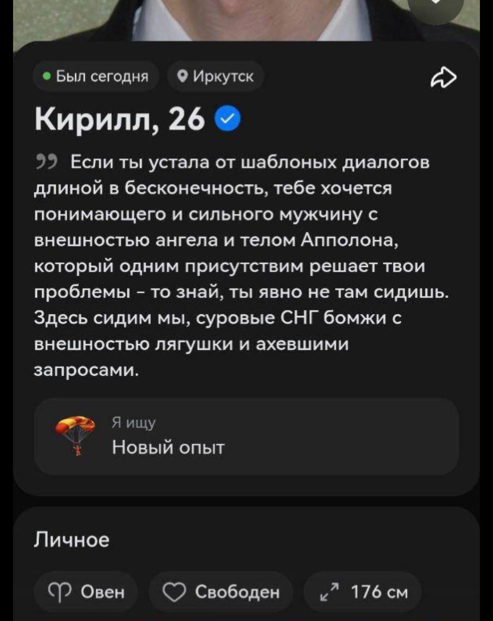>>10359286 > Ну лично я пришёл к выводу, что в профиле нихуя кроме интересов писать не надо. Это я подчеркнул в древнем видео Никиты Мартынова: что бабы читают все твои шутки, филосовские фразы, пожелания к паре, описание жизни...и делают вывод, что ты ебнутый. Просто из любой хуйни, какой бы замечательной и глубокой тебе она не казалась, цель бабы читающей твоей анкеты - доебаться что что-то не так и заигнорить. Они доебываются и игнорят. Да, наверное если написать что ты менеджер Газпрома - то это их обезоружит. Но я не менеджер Газпрома. Логично. Что-то указать можно, но много расписывать будет только отталкивать.