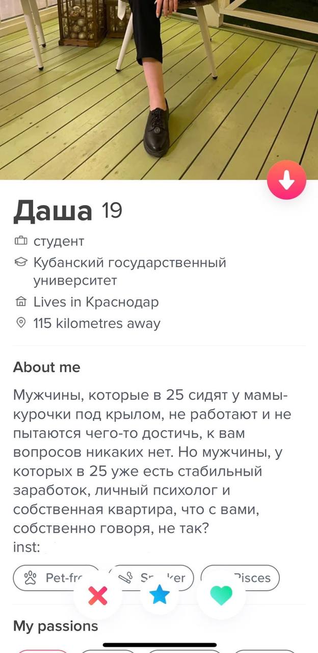 > 3)Третья психологиня, надо сказать помогла мне с тревожностью(у меня вообще расстройство личности) и про описание анкет сказала, что это хуйня. Вообще не важно что писать, тупо перебирай и перебирай и перебирай...рано или поздно повезёт или нет. Да это понятно но хочется то ведь повысить шансы. У меня разок такой на СЗ был. Пообщались текстом вечер и на следующий день меня в чс отправили. А все потому, что надо было видимо сразу на свидание звать. А я на это даже не намекнул. Причем общались норм, я ничего стремного ей не отправлял.