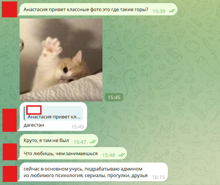 >Что говоришь во время созвона то обычно? Разговариваю минут 30-40, обычно вначале по интересам тян, потом гну свою линию, пизжу о всяком.. Потом заставляю застесняться пару раз, будь это комплиментами, или какими-то вопросами. Ну и договариваюсь купить мне пиво, апилируя отсуствием паспорта