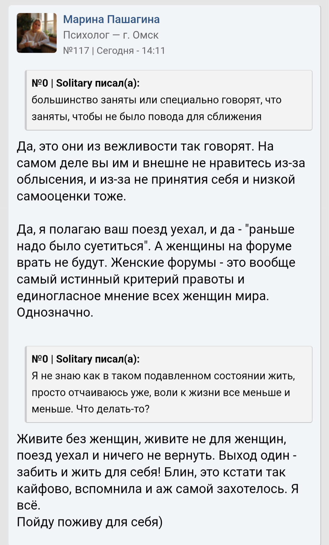 >>10355014 >>10354996 Потому что подразумевается, что женщина - это тоже человек и она может понять другого человека. Не очень понятно нахуй нужна женщина, если её мышление по определению пола ограниченно? Что она может дать? >хотел бы измениться и решения проблемы- пришел бы на мужской форум там бы ему натыкали гору хуев и выдали базу, как Изменить Себя И как бы это помогло? Тупо грубое чмырение. Охуеть помогает. Ну вот мне на мужских форумах затирают, что надо быть наглым и грубым. И я этого тупо не могу в свои 35лвл. И? Пиздую на пси.форум где одни бабы.