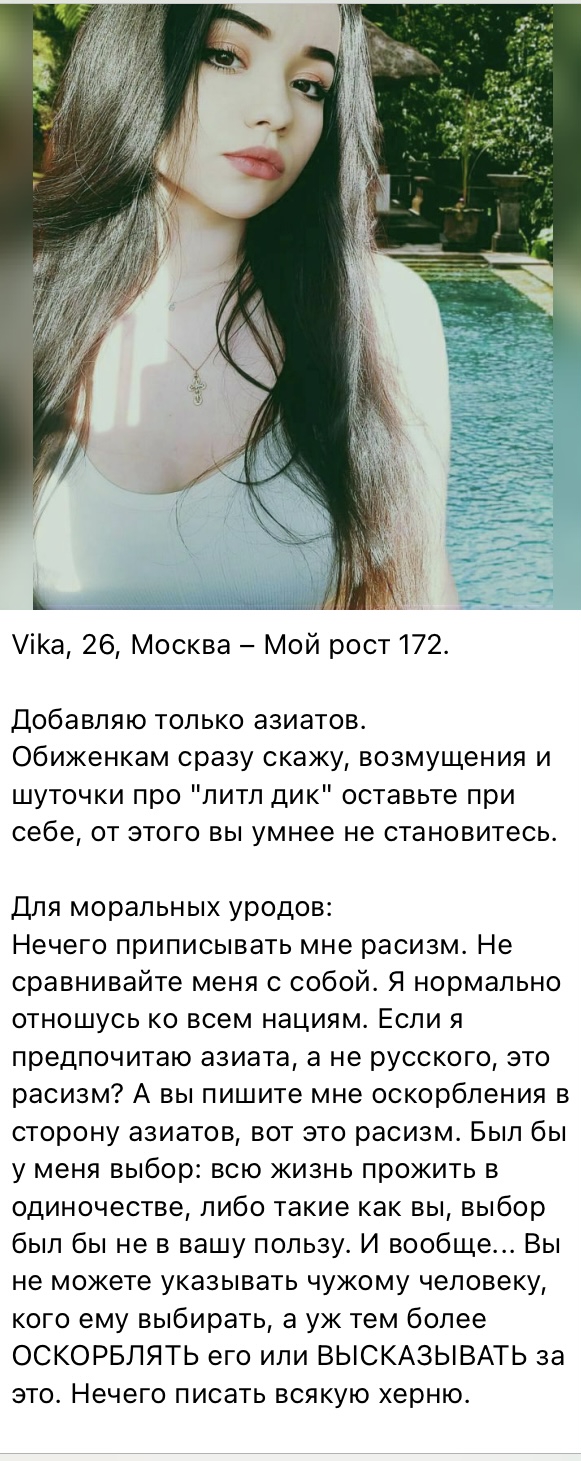 >>10359435 Какой нахуй феномен? >>10359785 >ты такой дохуя обычный внешне Ну вообще ты ответил не мне, а анону у которого моя фотка есть. Но и я не считаю свою внешку модельной. Могу объяснить только то что для определённого числа девушек подхожу под их какие то параметры. И я уверен что каждый анон, не имея недостатков на лице будет подходить определенному количеству девушек в типаж. >>10359786 Так не лайкать их. Лайкай тех, кого хочешь трахать. Хуйню спрашиваешь. >Хули игнорируешь? Мне с тобой 24/7 сидеть?