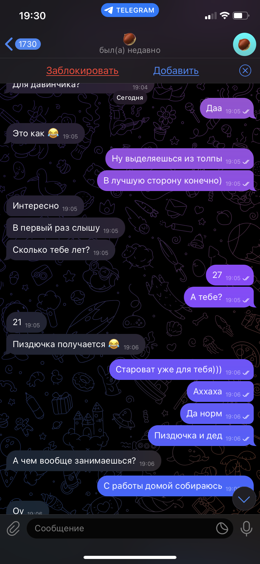 Как меня заебали эти диалоги на сз, почти каждый раз одно и то же. Спрашиваю что-то, она отвечает и все, ни встречных вопросов хотя бы на уровне «а ты?» ни предложения других тем, ни-ху-я. Просто держу каждый диалог на себе и хочу вскрыться нахуй уже от такого ежедневного насилия над моей психикой. Вот одна тп написала мне недавно, что парень у нее есть, просто хочет попиздеть с кем-то, но с тян у нее не получается почему-то. Действительно блять, не потому ли, что вы от своего похуизма разучились общаться уже даже между собой. Другой тне то нахуй не надо симпить, если она не лезба, в отличие от среднекуна, который ради потенциальной возможности получить доступ к писичке будет шутки шутить и темы предлагать, фу блять фу нахуй. Сейчас пизжу с еще одной, уже третий вопрос задаю, на который получаю около односложный ответ, хз че с ней делать, гулять сразу позвать что ли, чтоб не тратить нервы дальше на бревно. Поделитесь как вы с такими индивидками подступаете, не скипать же каждую такую, поняшиться то хочется с кем-то.