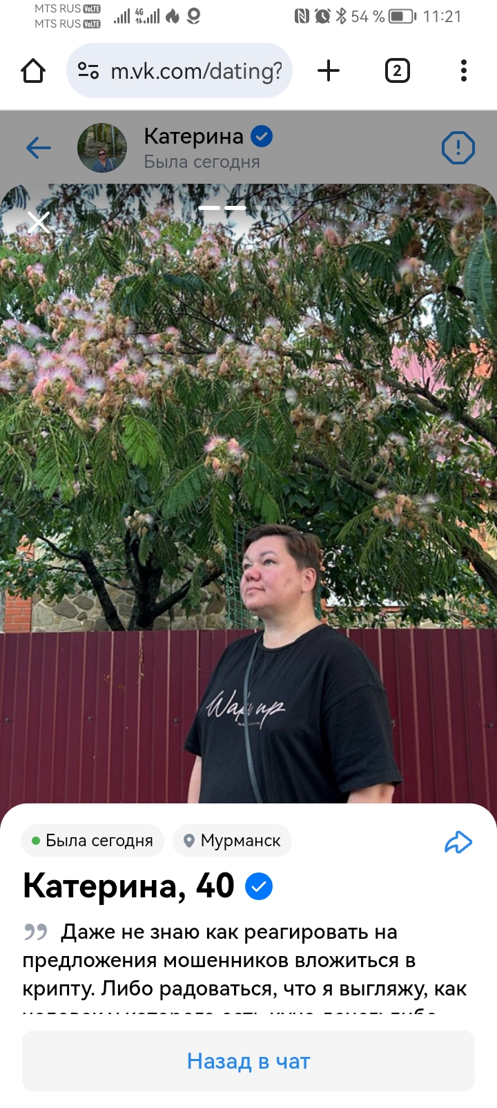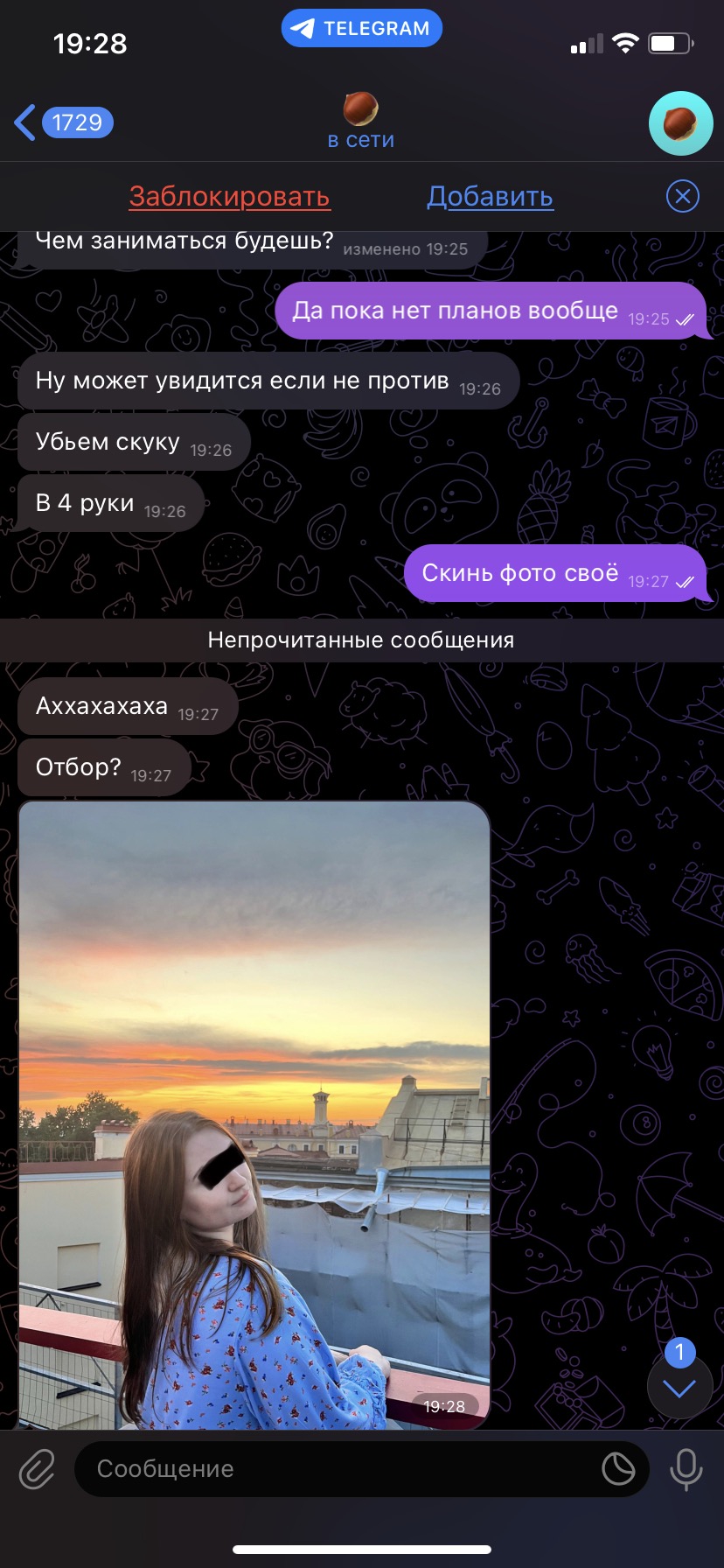 Итак милфа с которой целый день общался - даже не прочитала сообщение с предложением скинуть сиськи, хотя я ей фотку кинул, из-за которой пришлось купить премиум на таборе. Вторая милфа на вопрос большие ли у неё сиськи - проигнорила. Жаль. будем искать.
