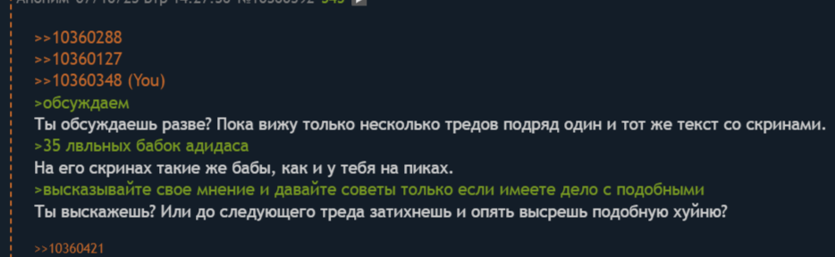 >>10360288 >>10360127 >>10360348 >обсуждаем Ты обсуждаешь разве? Пока вижу только несколько тредов подряд один и тот же текст со скринами. >35 лвльных бабок адидаса На его скринах такие же бабы, как и у тебя на пиках. >высказывайте свое мнение и давайте советы только если имеете дело с подобными Ты выскажешь? Или до следующего треда затихнешь и опять высрешь подобную хуйню?