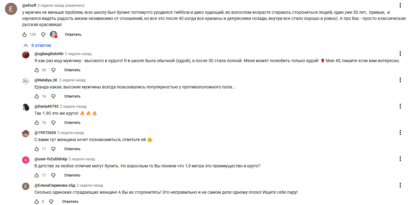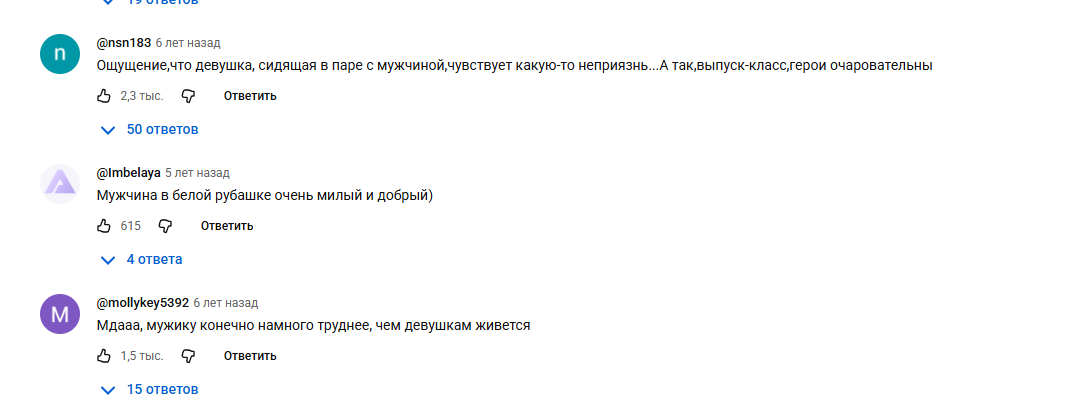 >>10364488 → Клевая серия! На передачу пришла девушки и мужчина, оба ростом примерно по 140. Так вот когда говорила она, он спокойно слушал, приветливо улыбался, вел себя достойно, а когда говоил он, она кривила лицо, закатывали глаза и т.д. Кто-то в комментах предположил, что он за кадром пытался с ней флиртовать