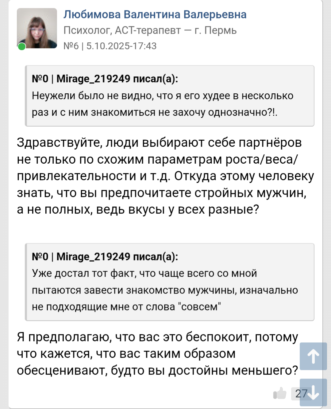 >>10364600 → Они и не пиздят по сути, абсолютное большинство просто настолько глупы, что реально так считают. >>10363765 → Она говорит, что прически мальчиков обсуждали в школе и что волосы влияют на внешку, это правда, только вот Славка с 3/10 ебалом за мальчика ими никогда не считался как ни крути и она не способна это понять. Они еще верят, что им внешка не важна, потому что при каких-то особых условиях им может понравится 7/10 кун, это ниже среднего в их восприятии, а значит внишнасть ниважна))0). Ниже для них не мужчины и вообще не люди, в их голове мы нигде не учитываемся, отсюда такие заблуждения. Выходит она эту чушь искренне высрала с верой, что может кому-то помочь