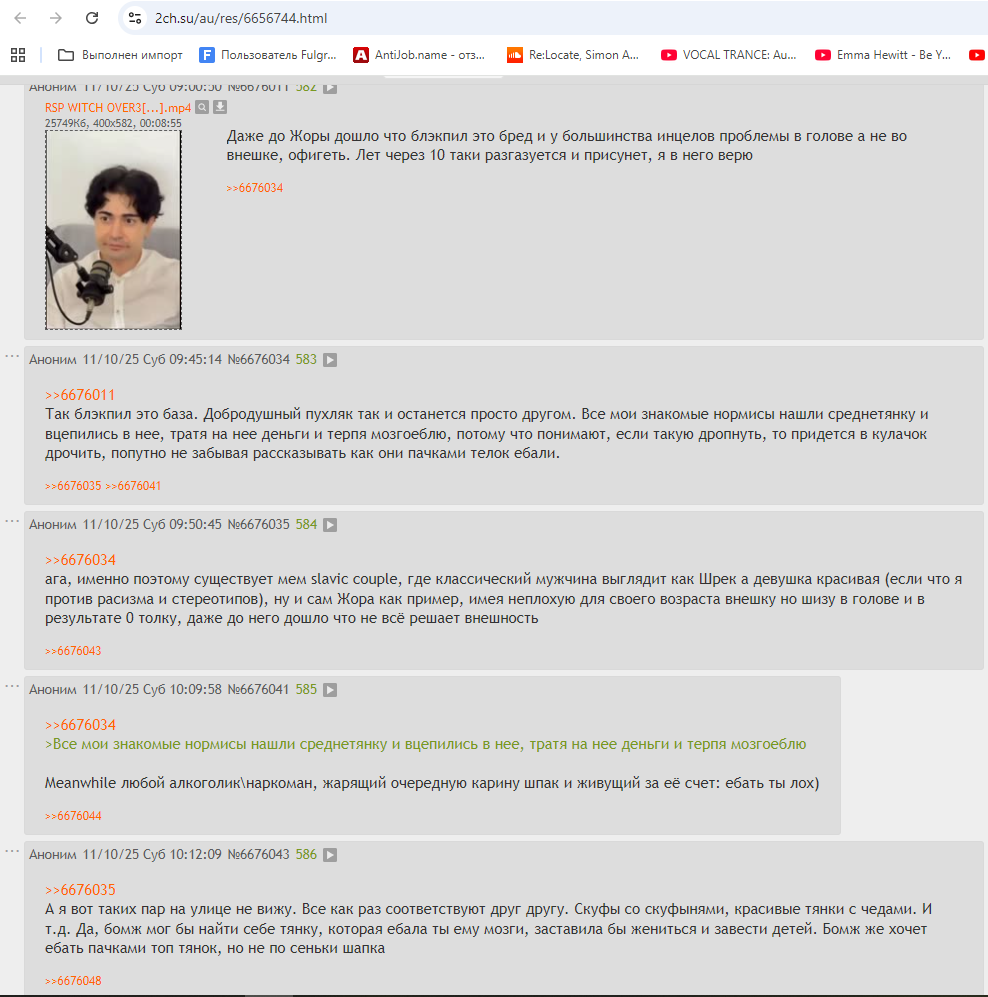 В тред приглашаются инцелы 21+ лвла. Инцел - девственник не по своей воле. Если вы имеете комбо по этим пунктам: 1. Рост ниже 180 см. 2.1 Член менее 15 см по длине 2.2 Член менее 11 см по обхвату 3. Внешность хуже, чем 5/10 4. Кудри как у клоуна(не путать с волнистыми волосами) 5. Отсутствие жилья (проживание с родителями, коммуналке, соседями-рандомами по квартире). 6. Наличие узкой челюсти, отсутствие подбородка, плохая максилла 7. Листва или отсутствие секса годами 8. Не целован 9. Проблемы с психикой 10. Излишняя худоба или излишний жир 11. Нищебродство 12. Асоциальность 13. Узкие плечи 14. Глаза жертвы 15. Поведение омеги 16. Писклявый голос, шепелявость, картавость 17. Опухшесть лица, проблемы с кожей 18. Короткие пальцы 19. Не растёт борода 20. Подростковый возраст прошёл за видео-играми 21. Ненависть к себе 22. Ненависть к парочкам на улице 23. Чрезмерная любовь к аниме 24. Безысходность 25. Ранние залысины/норвуд 26. Употребление алкоголя/веществ в одиночестве 27. Дисморфофобия 28. Сутулость 29. Сексуальные девиации 30. Отказы от противоположного пола на СЗ/ИРЛ/школе/универе/работе, несмотря на попытки познакомиться/назначить встречу/пообщаться с дальнейшем игнором и ЧС то добро пожаловать в наш скотомогильник! На заметку: внешность>рост>хуй. Но лишь при условии, что рост>=183 см и/или внешность >=7/10, в ином случае последние будут препятствием на фазе знакомства. Делимся проблемами, переживаниями, поддерживаем друг друга. Основная теория: https://incels.wiki/w/Main_Page