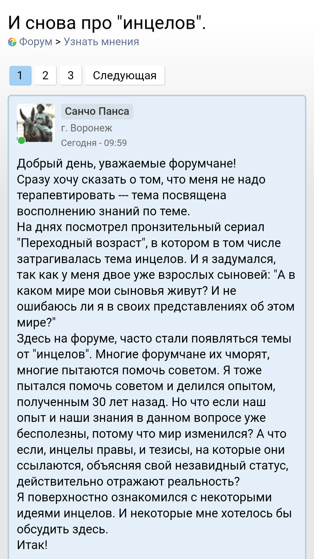 >>10366913 Рост числа мужчин-инцелов, действительно, происходит. Увидел данные американских социологов. В 2022-2023 годах 17% молодых мужчин в возрасте 23-28 лет были девственниками, а в 2017-19 годах – только 7%.