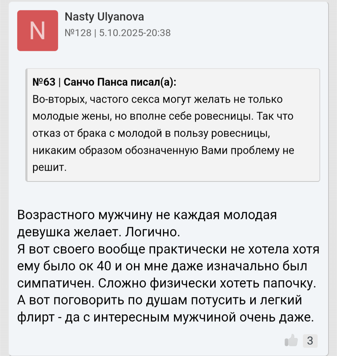 >>10365274 ок. Согласен с Миражихорй. Тоже будучи 40 летним мечтаю о 20 летней Стейсухе/ Но стараюсь соответствовать тому что можно удержать, кроме времени. Не отращиваю живот и вообше слежусь за собой.