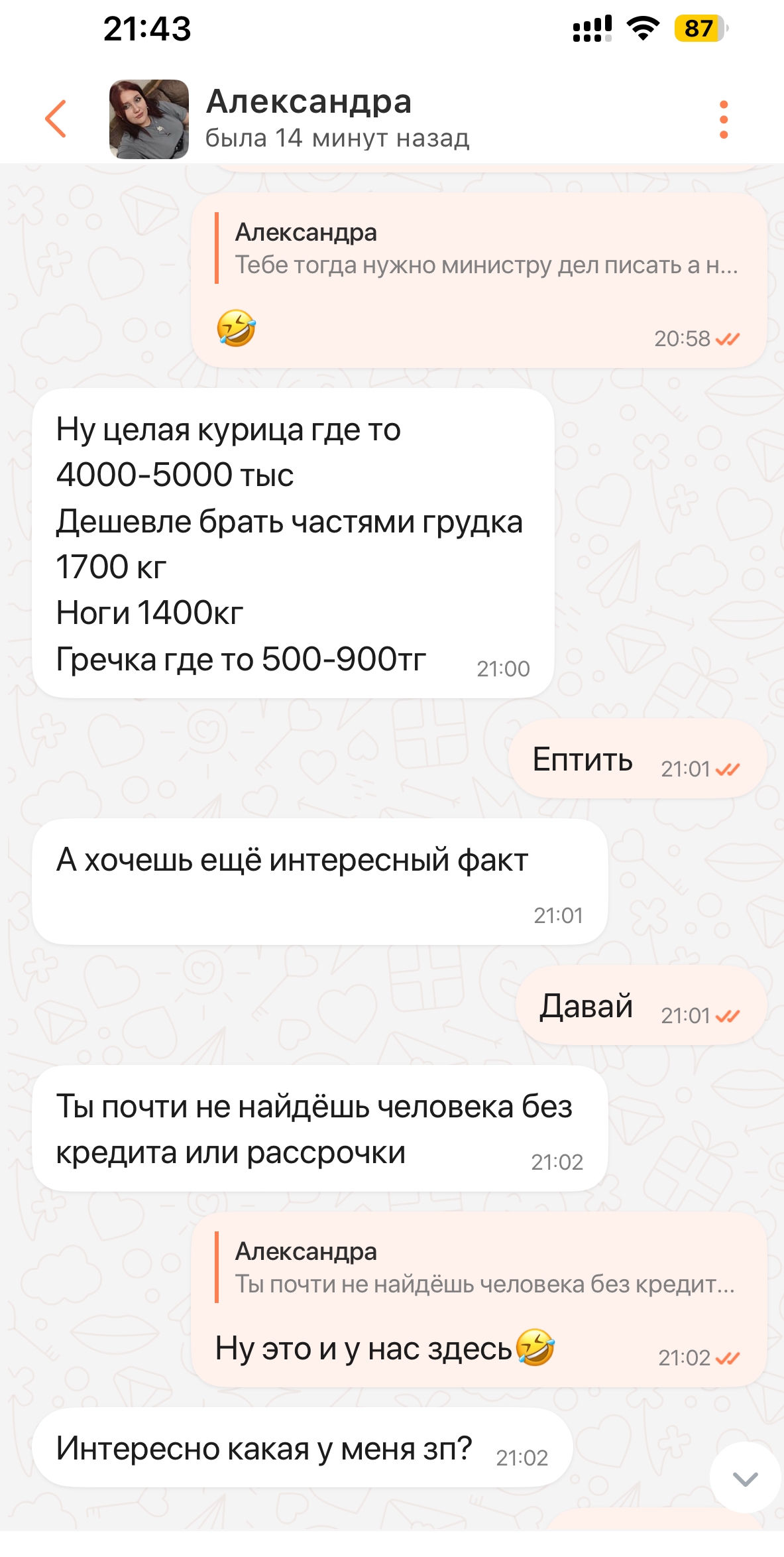 Вот. Типа того,барбосы. Этот подкат далеко не первый. Катил шары к проводнице. Катил шары к бабе на ресепшне (подкатил хитроумно, она ошиблась и не в тот чат отправила мне в ответ по Whatsapp сообщение, а я ей предложил связь и потеснее. Сначала ватсаппаом, потом на ресепшне, прямиком). Да, отшила, но похуй, она в таком месте работает что неудивительно (ресепшн гостиницы).