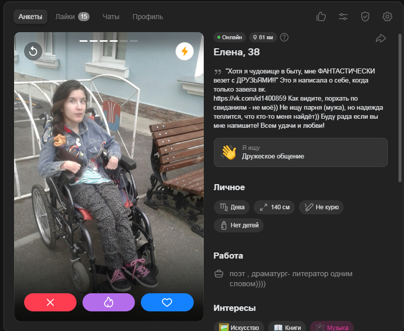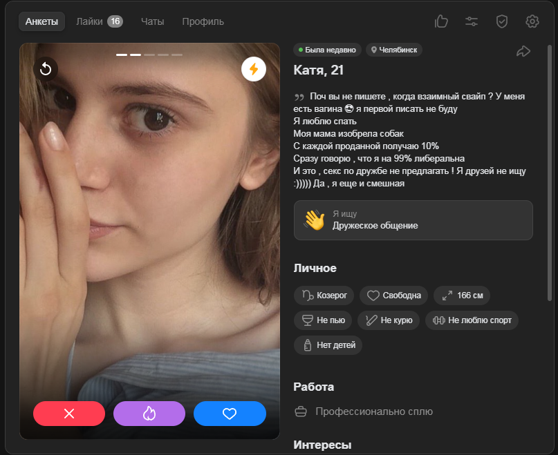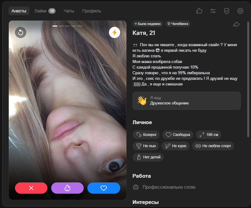 Алсо между делом. В винчике если ты девка и поиск по девкам. Там и сами лайки ставят и пишут и вообще в анкетах не стесняясь указывают что ищут фвб. За парня такое зуй увидишь.